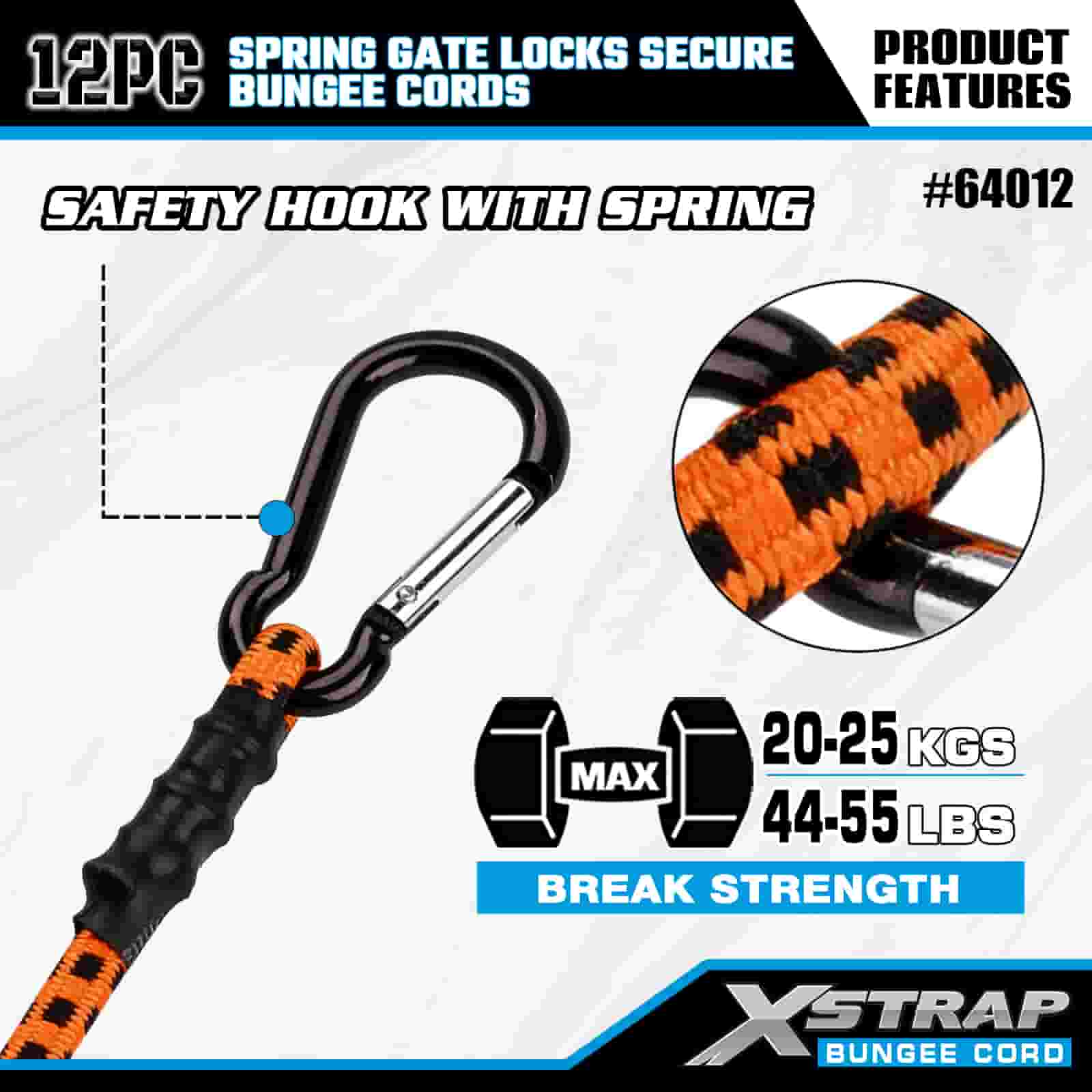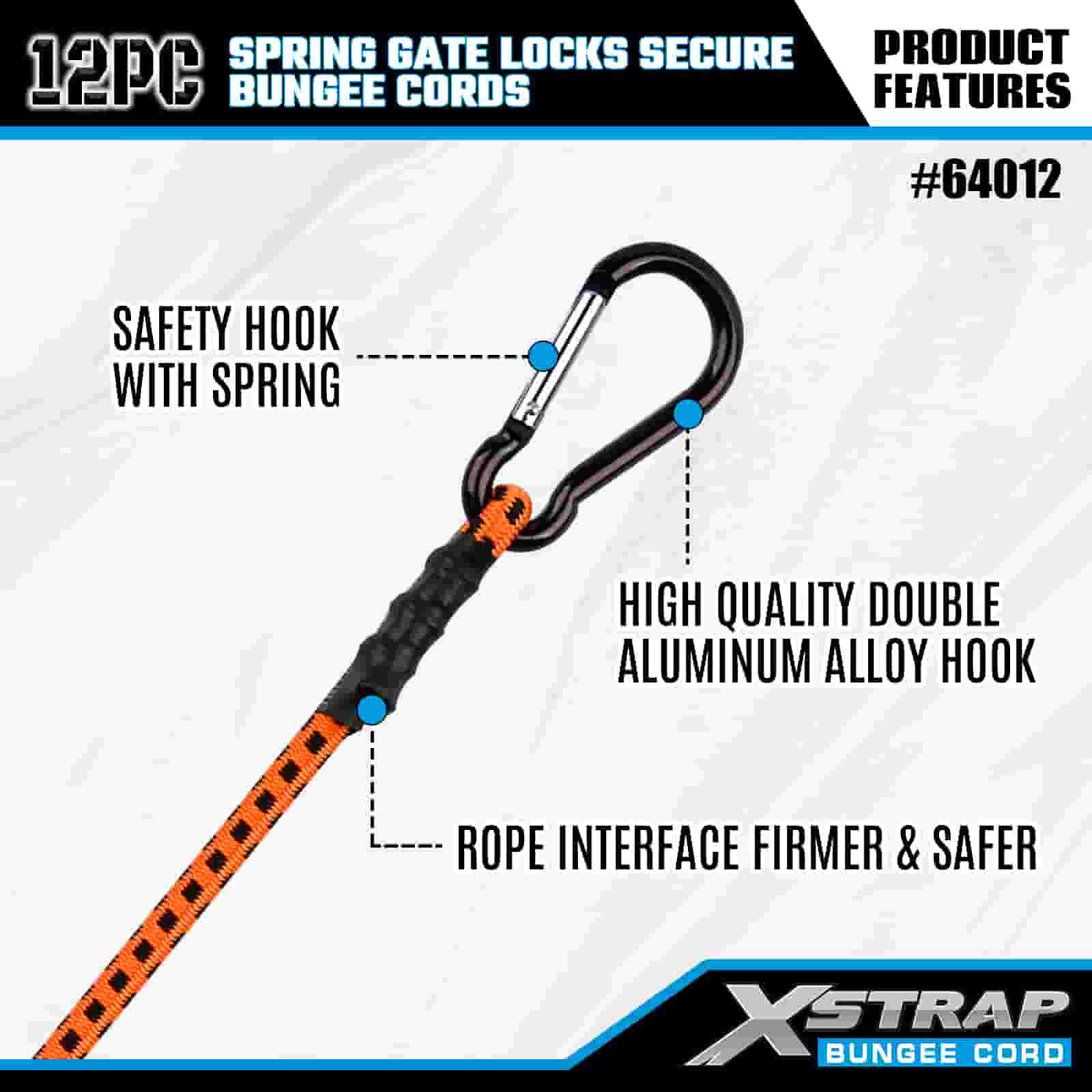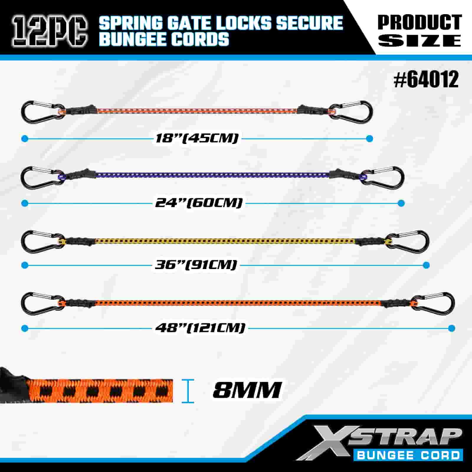 Xstrap 12PK Verrouillage de portail à ressort Cordons élastiques sécurisés 8 mm x 18"/24" /36"/ 48", résistance à la rupture de 88 à 110 lb avec mousquetons avec verrouillage à ressort sécurisé.