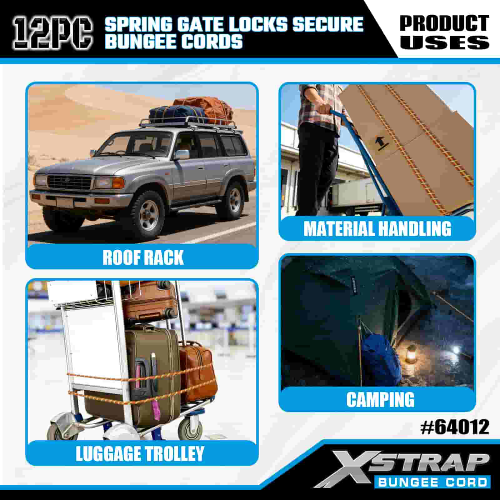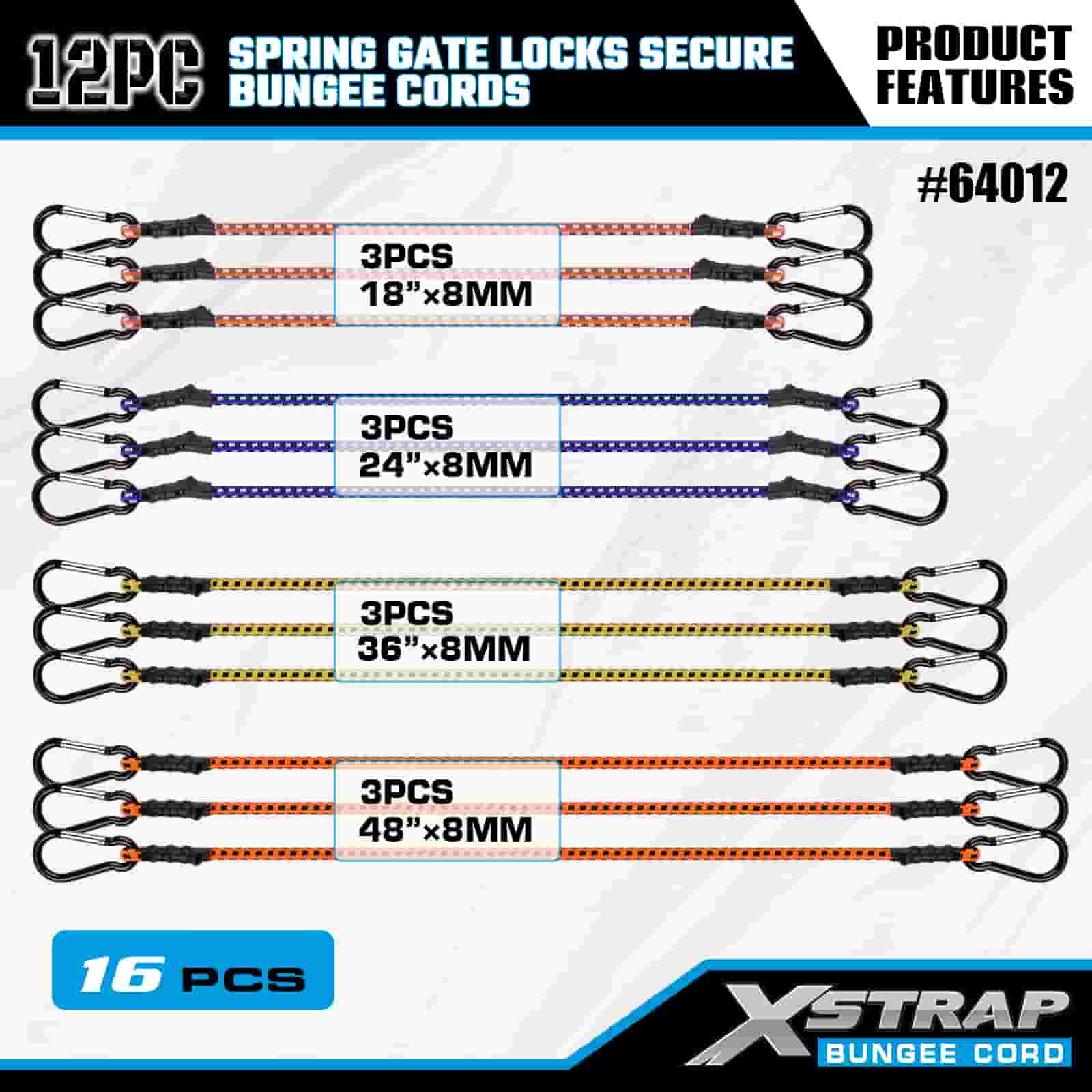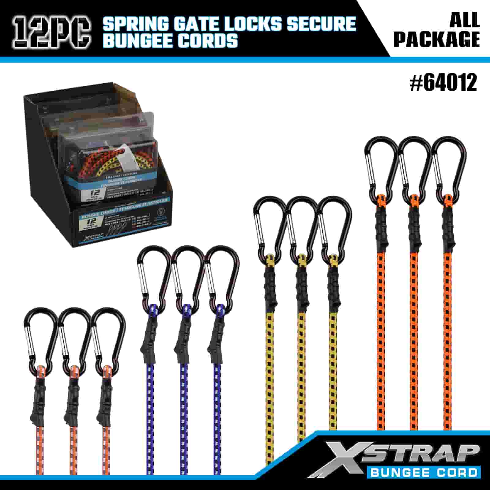 Xstrap 12PK Verrouillage de portail à ressort Cordons élastiques sécurisés 8 mm x 18"/24" /36"/ 48", résistance à la rupture de 88 à 110 lb avec mousquetons avec verrouillage à ressort sécurisé.