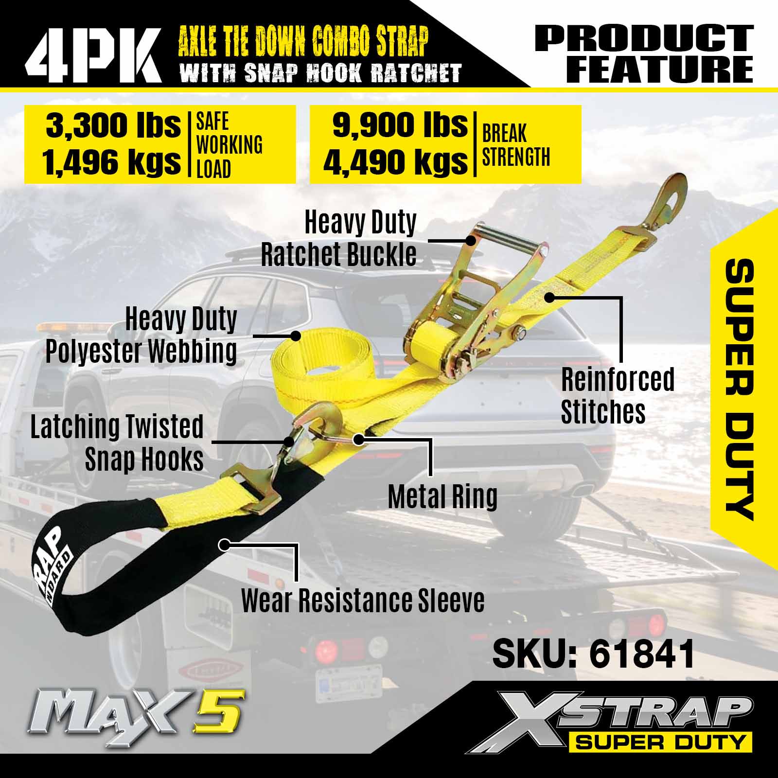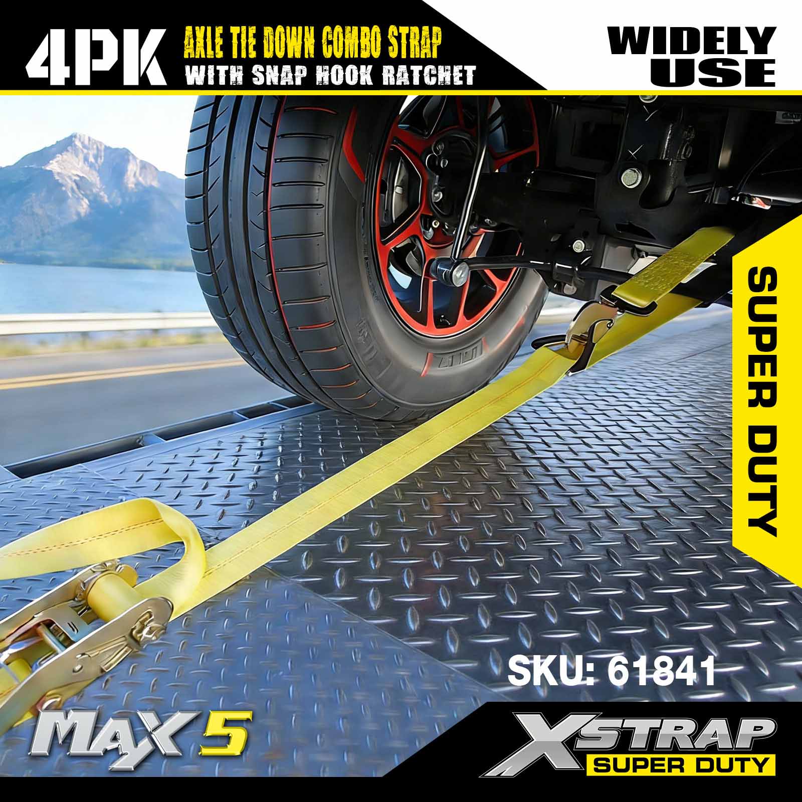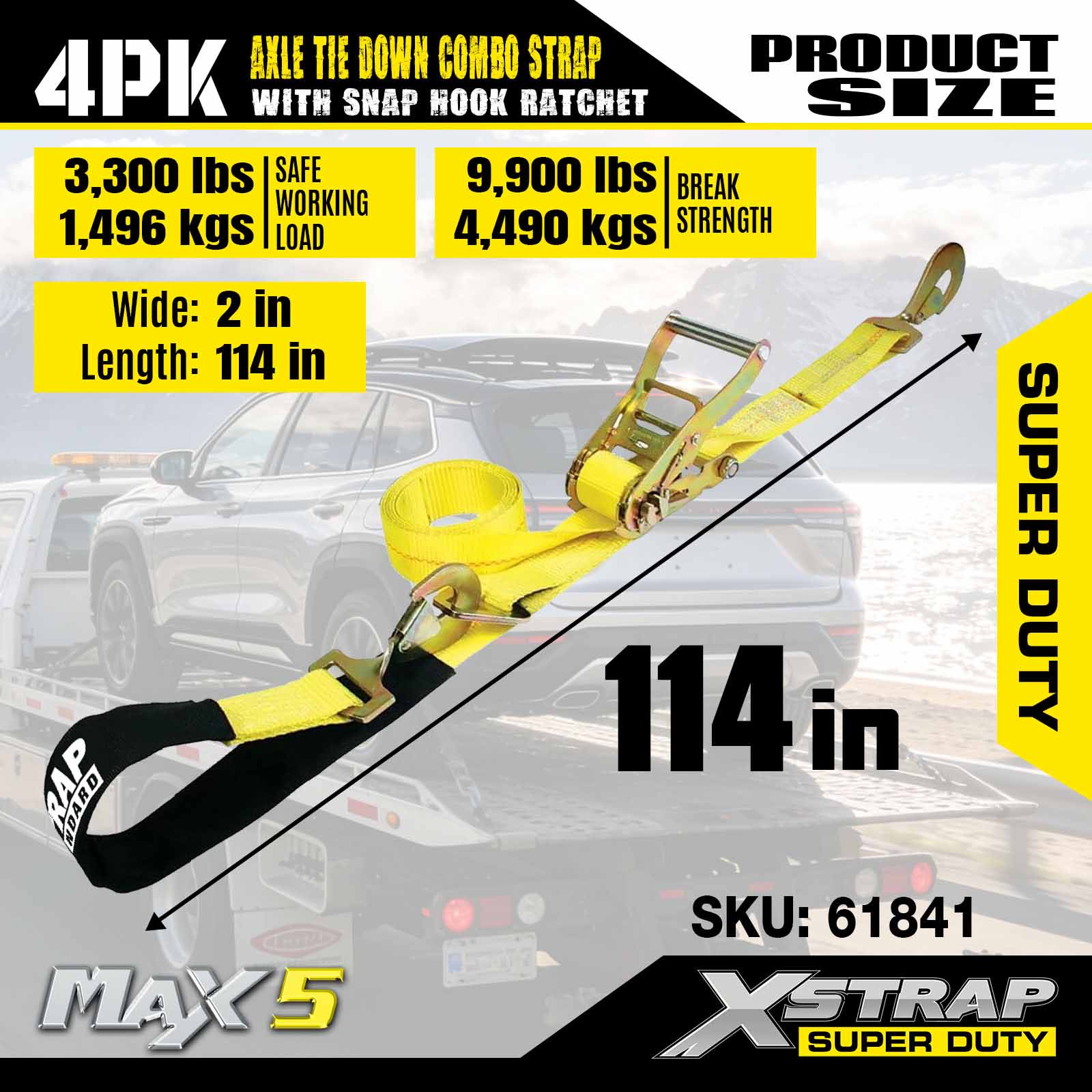 - Pack de 4 sangles d'essieu de 114 pouces : des attaches automatiques à lasso polyvalentes sont utilisées pour passer à travers les jantes du véhicule transporté et peuvent également être fixées à n'importe quelle partie solide de la roue, de l'essieu ou du cadre.