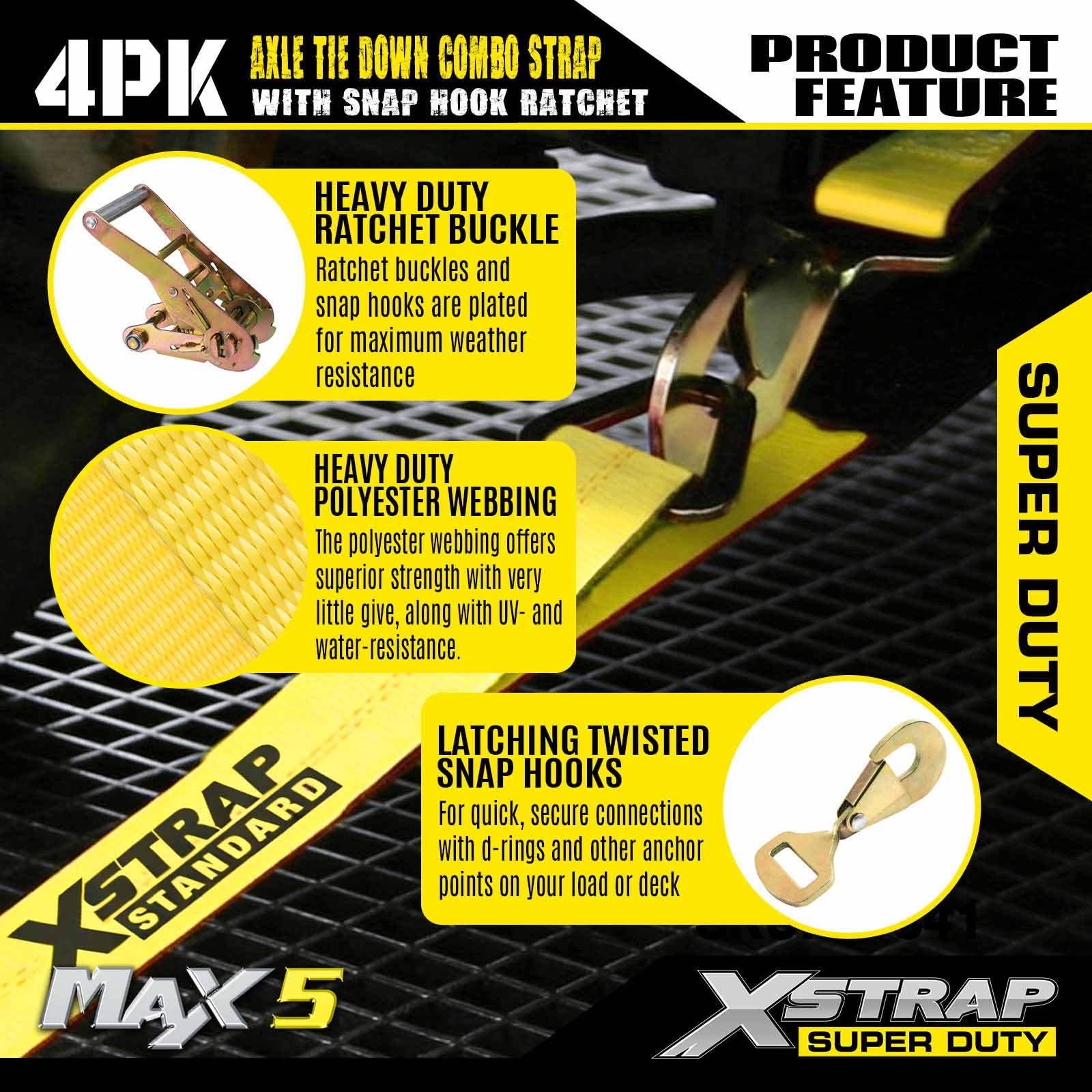 Xstrap Lot de 4 sangles d'arrimage à cliquet robustes – Kit de transport de voiture avec mousquetons – Résistance à la rupture de 4,5 kg – Attaches de véhicule de qualité professionnelle