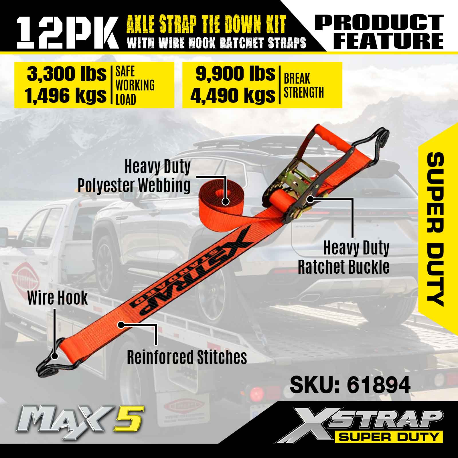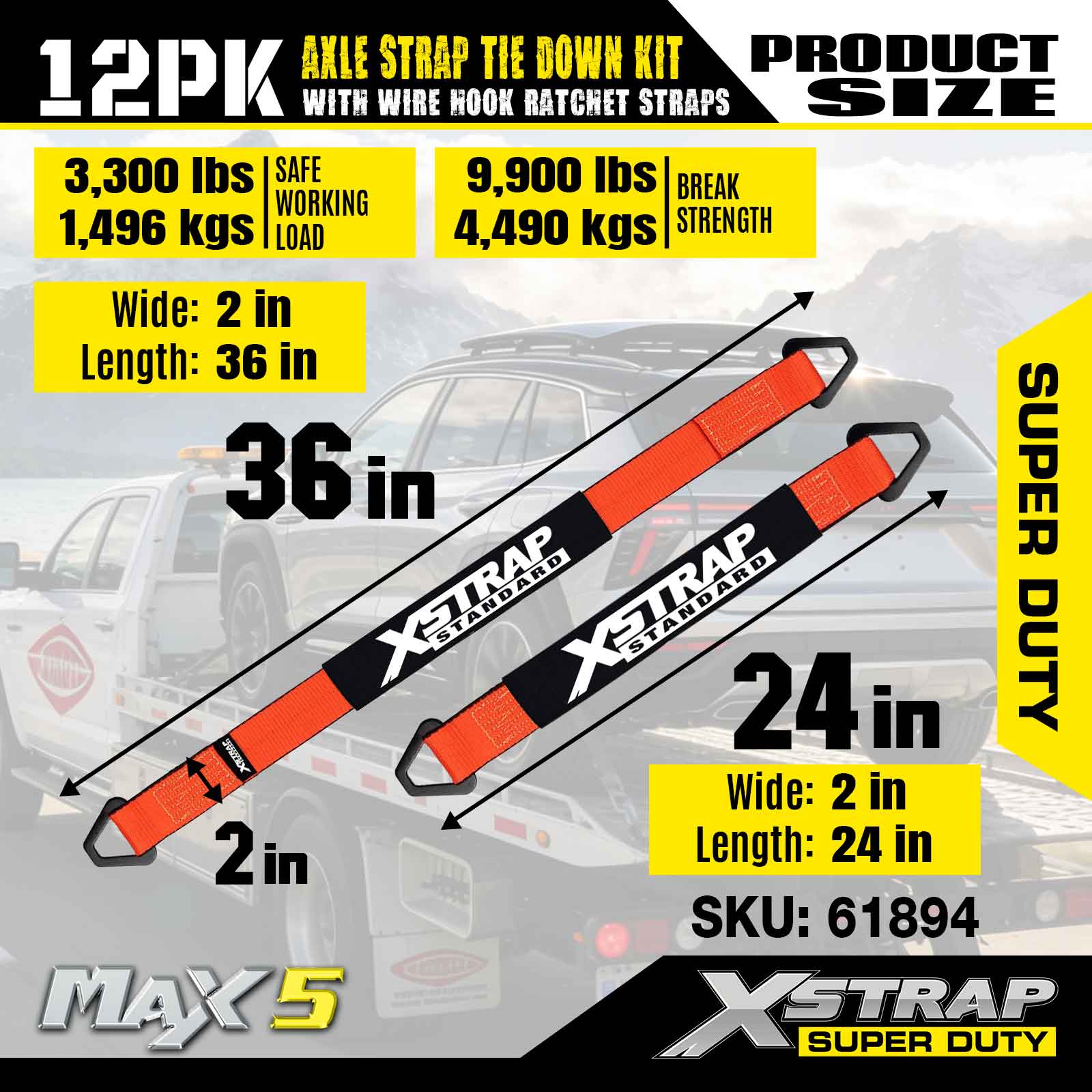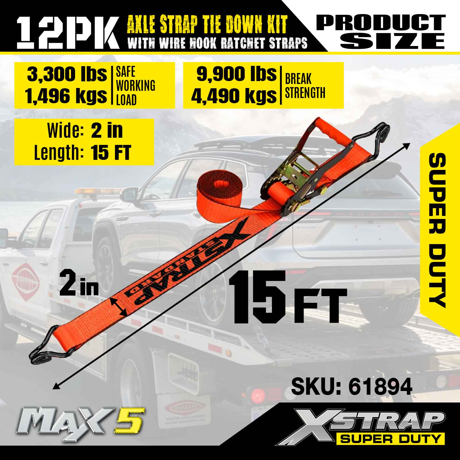 Kit d'arrimage de sangle d'essieu Xstrap 12PK (avec sangles à cliquet à crochet métallique) – Super Duty. Il a une charge de travail sûre de 3 300 LBS (1 496 kg) et une résistance à la rupture de 9 900 LBS (4 490 kg).