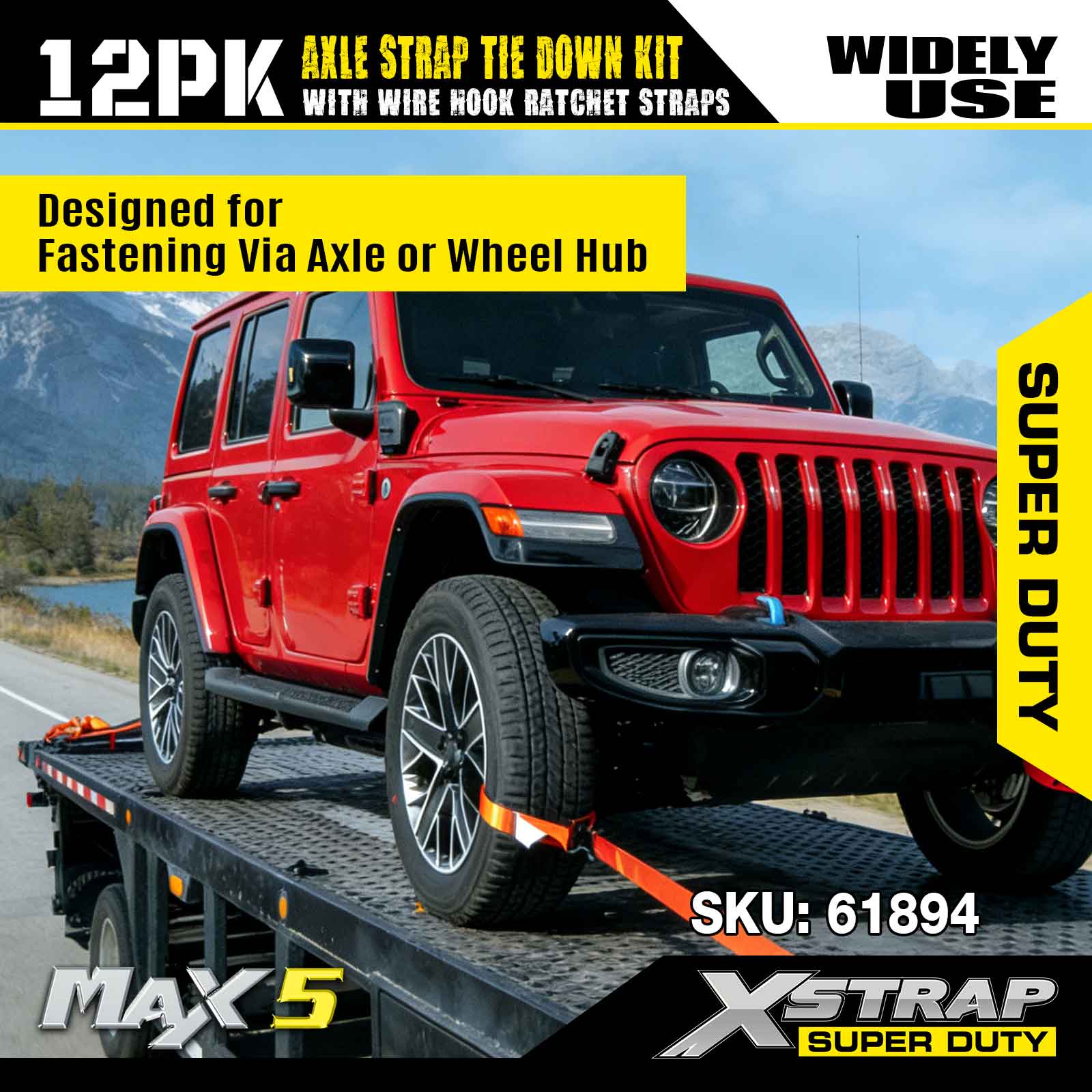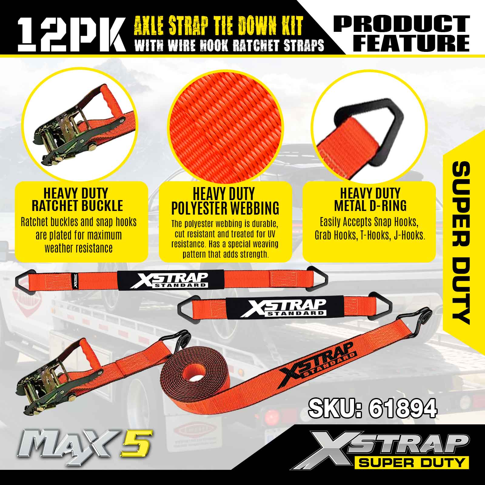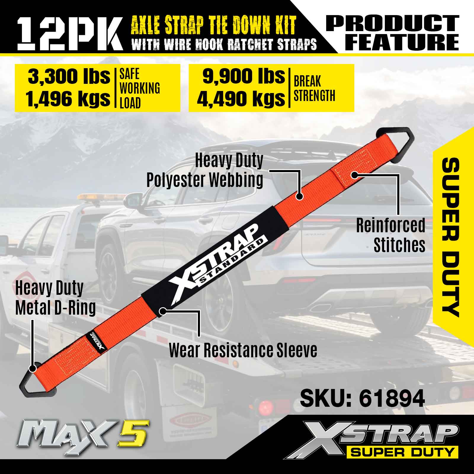 Kit d'arrimage de sangle d'essieu Xstrap 12PK (avec sangles à cliquet à crochet métallique) – Super Duty. Il a une charge de travail sûre de 3 300 LBS (1 496 kg) et une résistance à la rupture de 9 900 LBS (4 490 kg).