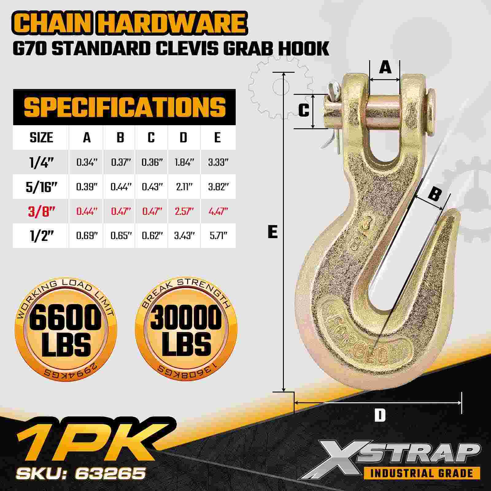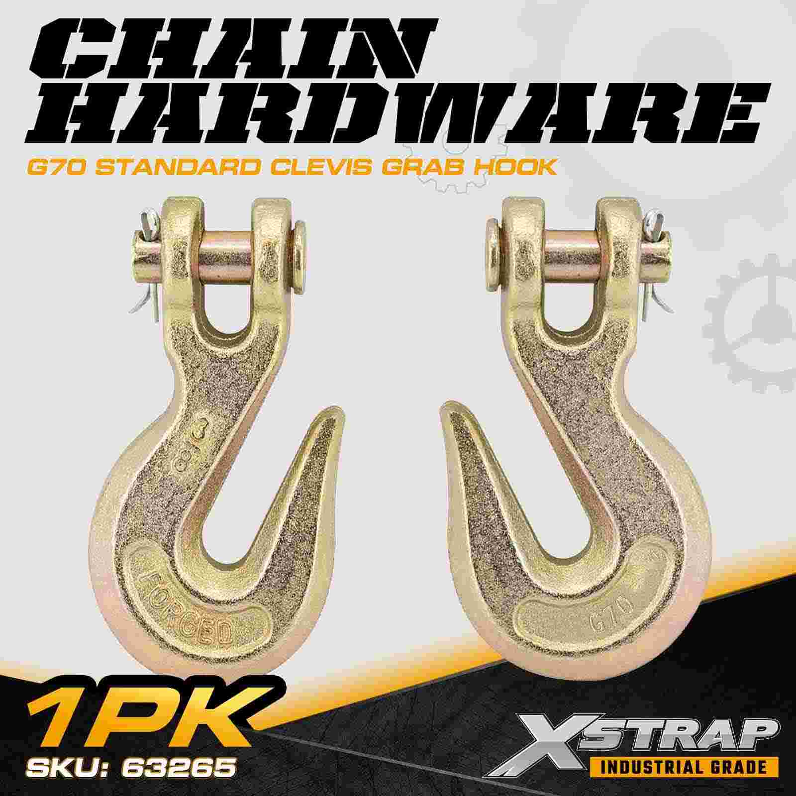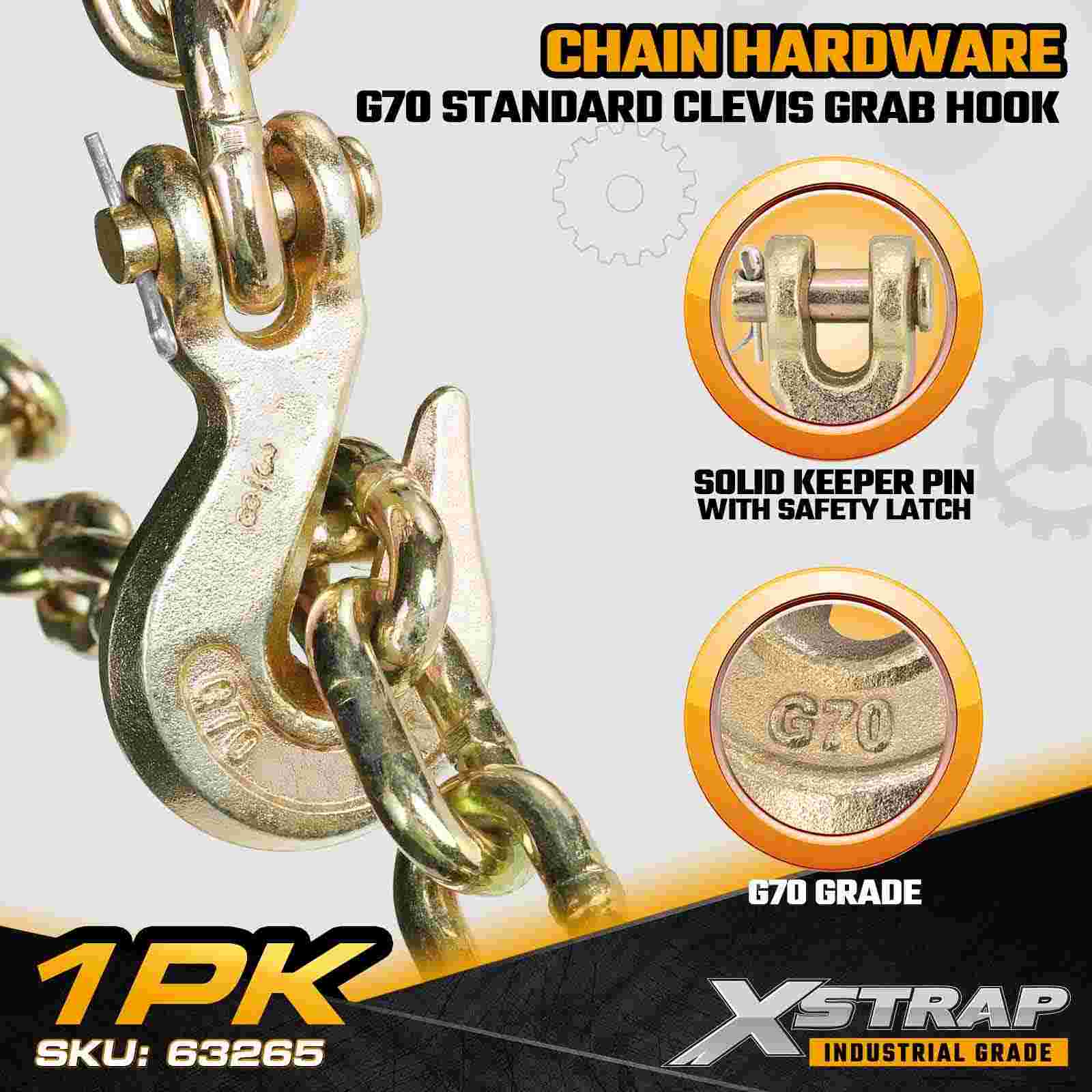 Le crochet de préhension à chape standard Xstrap 63265 3/8" est un composant de chaîne de transport de grade 70 conçu pour les remorques à plateau, les systèmes de remorquage et l'arrimage de charges industrielles robustes. Fabriqué en acier allié à haute résistance et protégé par une finition chromate dorée résistante à la corrosion, ce crochet de préhension G70 offre des performances fiables pour les opérations de transport exigeantes. La conception à chape assure un engagement rapide de la chaîne et un contrôle sécurisé de la charge, ce qui le rend idéal pour le transport professionnel et le fret. applications de liaison et d’arrimage d’équipement.