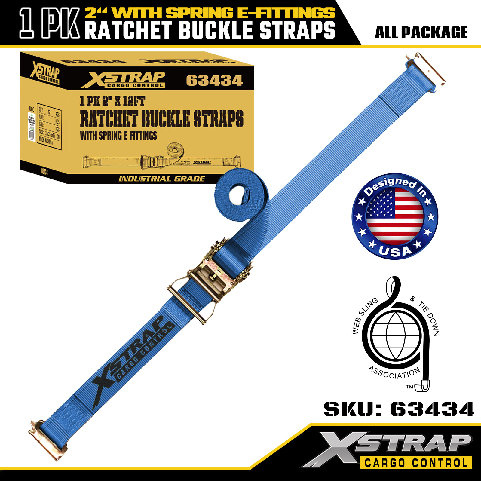 2" x 20' 1PK Sangles à boucle à cliquet avec raccords E à ressort