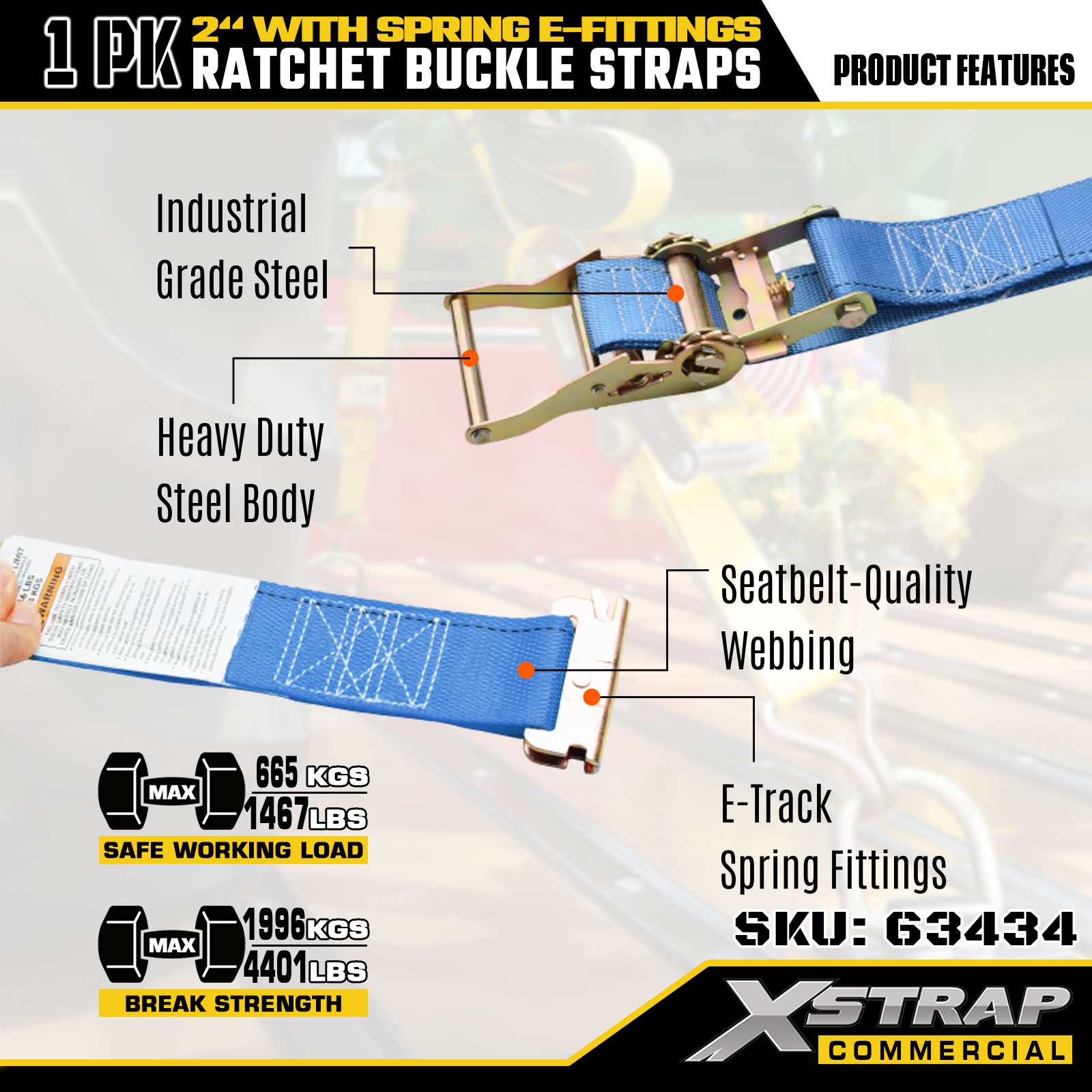 Xstrap 1 paquet de sangles d'arrimage à cliquet, sangles de sécurité en polyester de 2" x 20', charge de travail sûre de 1467 lb et résistance à la rupture de 4401 lb, avec raccords E à ressort pour camion, tondeuse, VTT