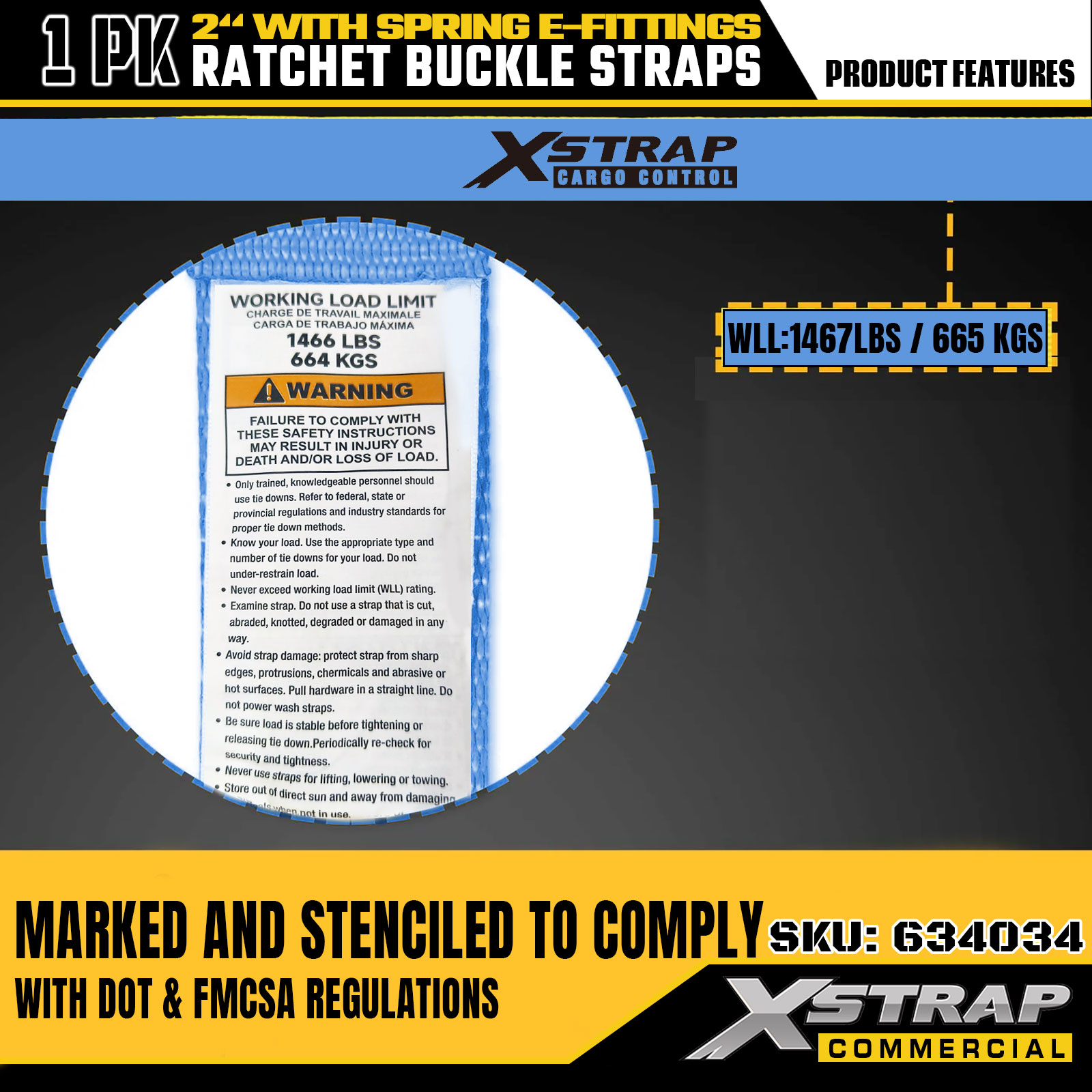 - Marquages clairs de capacité de charge pour une application sûre : clairement étiquetés avec une charge de travail sûre (SWL) de 1 467 lb et une résistance à la rupture maximale de 4 401 lb. Fourni des conseils de sécurité essentiels pour éviter la surcharge et assurer la sécurité des marchandises pendant le déplacement et le transport.