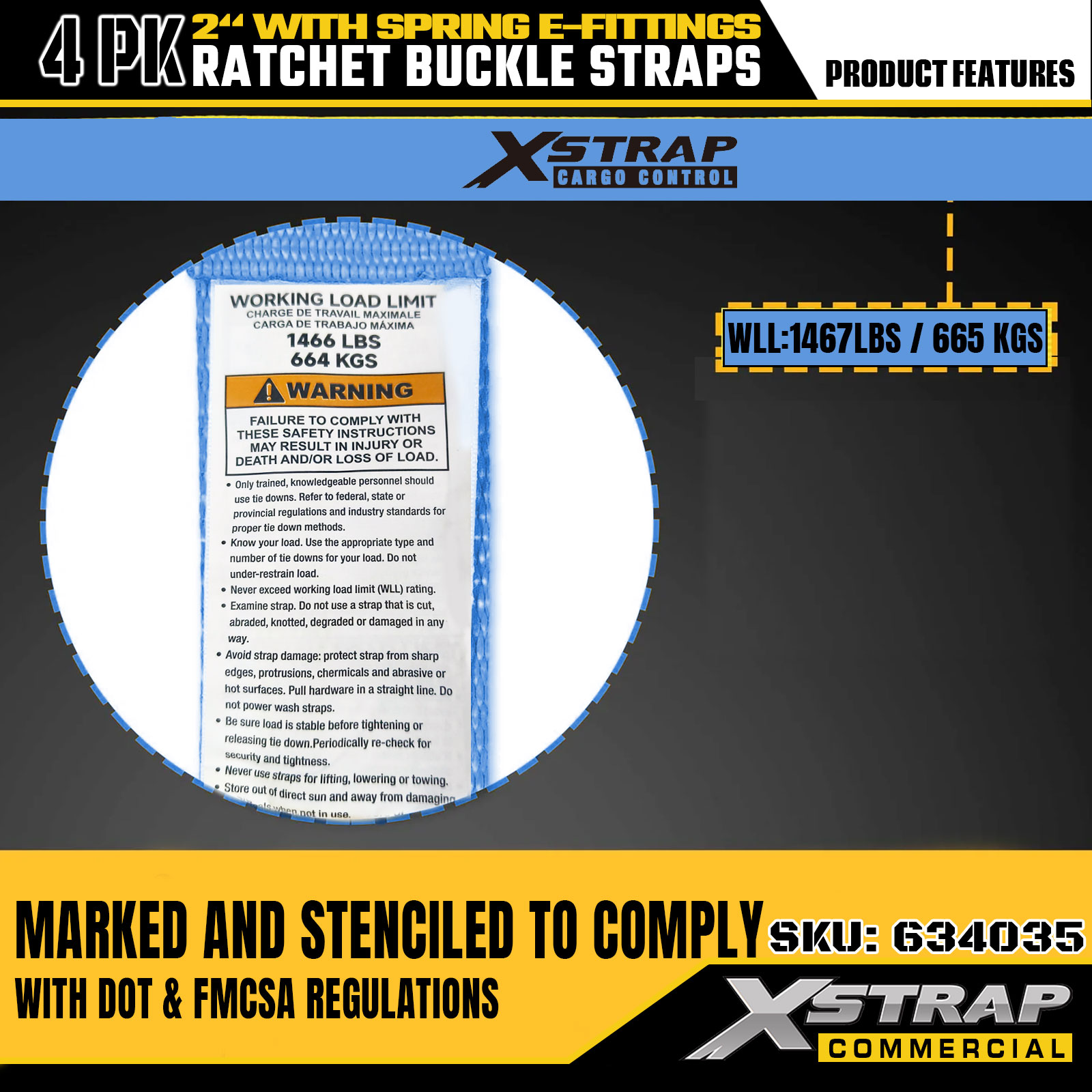 - Étiquettes claires SWL et de résistance à la rupture pour la prévention des surcharges : chaque sangle est clairement étiquetée avec une charge de travail sûre (SWL) de 1 467 LBS et une résistance à la rupture maximale de 4 401 LBS, fournissant des informations de sécurité essentielles pour éviter les surcharges.