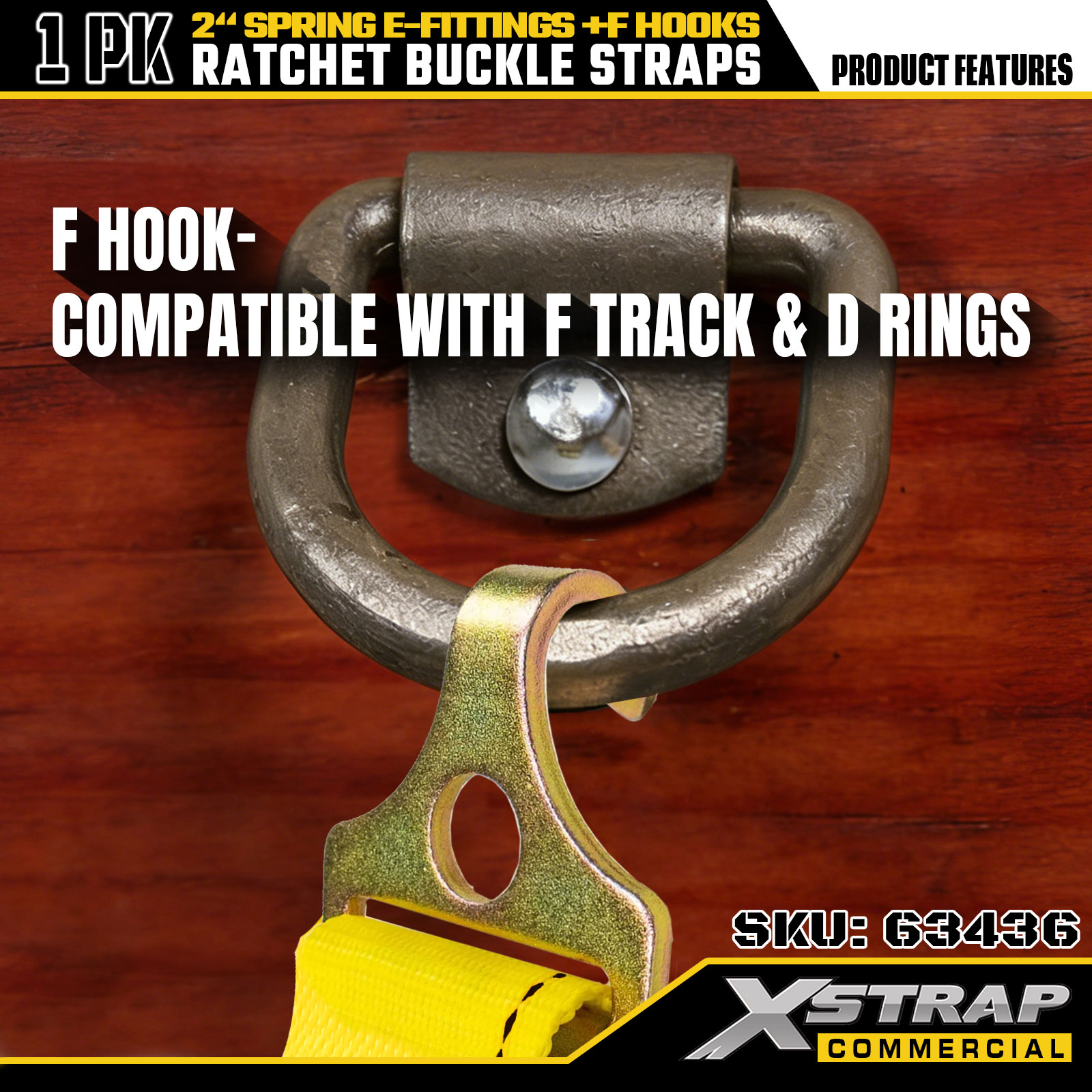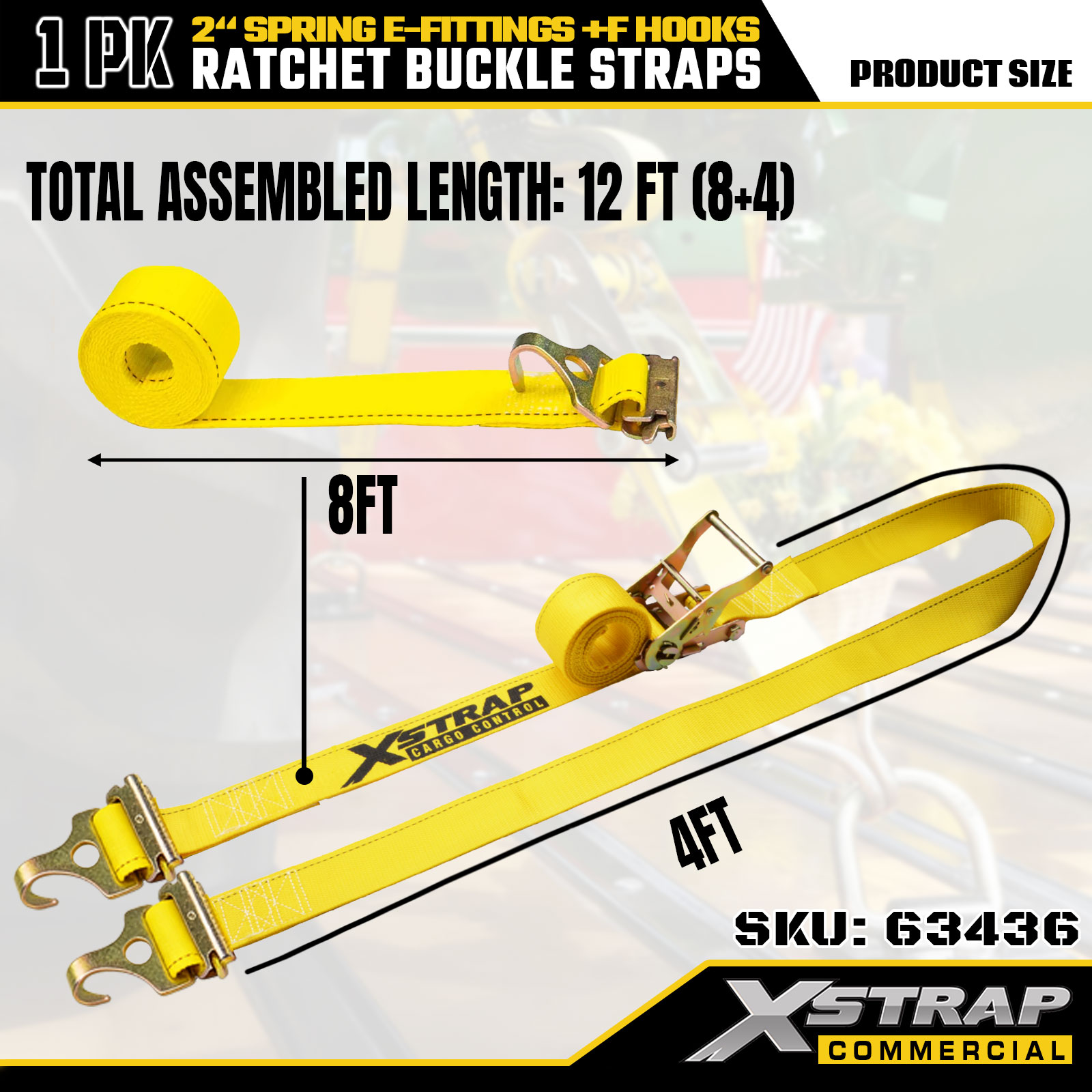 Xstrap 1 paquet de sangles d'arrimage à cliquet, 2" x 12', attaches de chargement robustes avec raccords en E à ressort et crochets en F (jaune), capacité de 733 lb pour la fixation de remorques, camions, fourgonnettes et motos