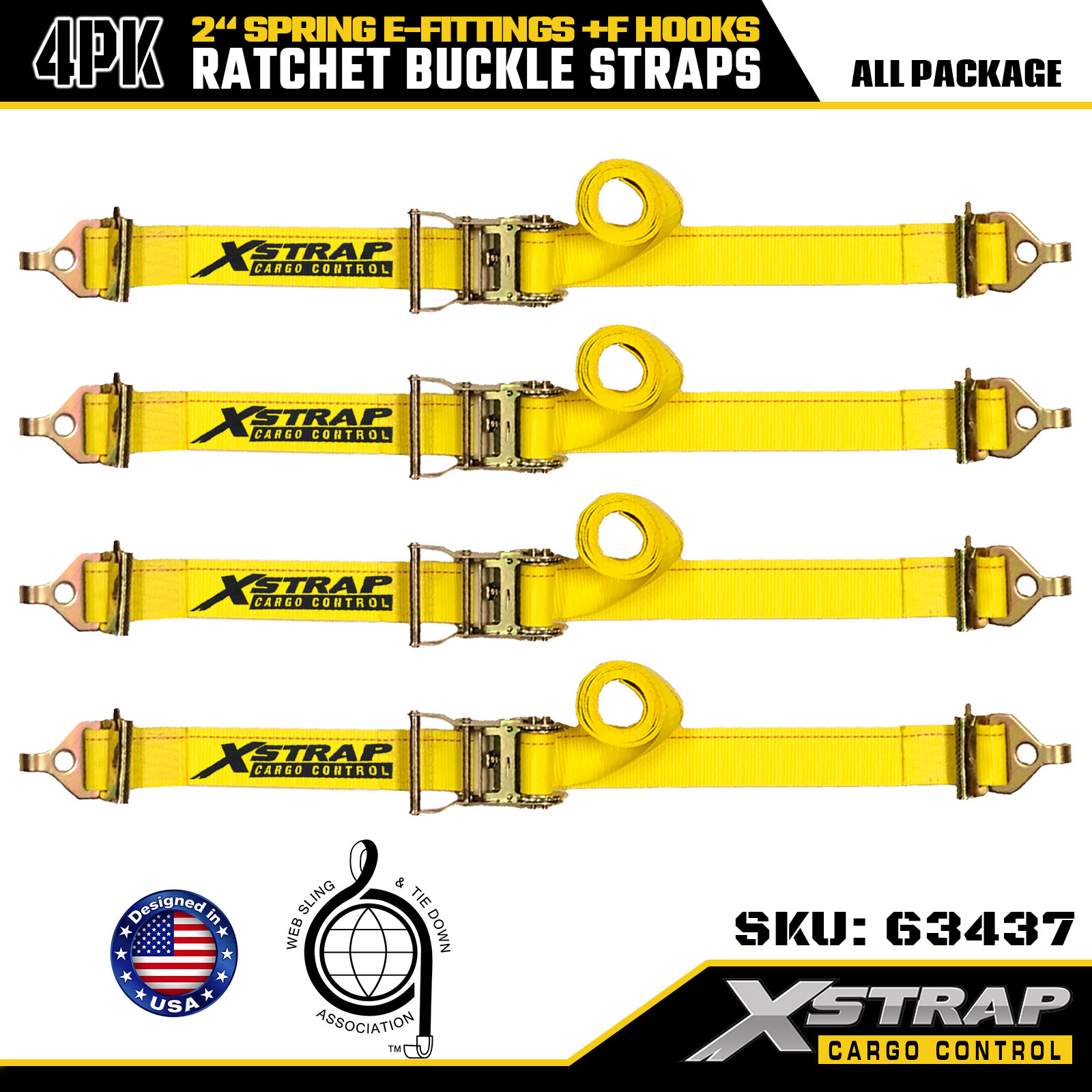 Xstrap Lot de 4 sangles d'arrimage à cliquet robustes, 5,1 x 30,5 cm, en polyester haute résistance avec raccords à ressort en E et crochets en F, 733 lb, sangles d'arrimage robustes pour remorques, camions, fourgonnettes et motos