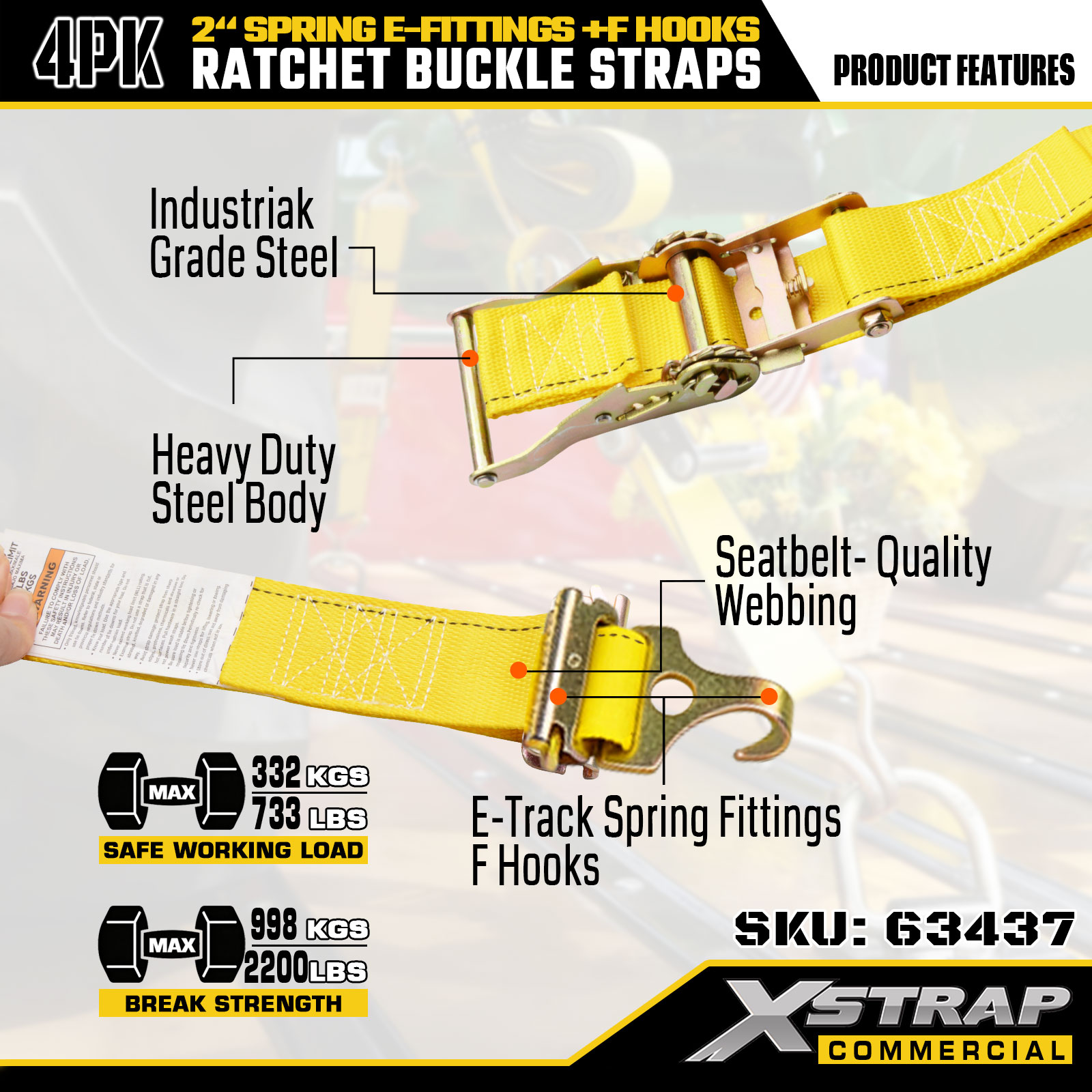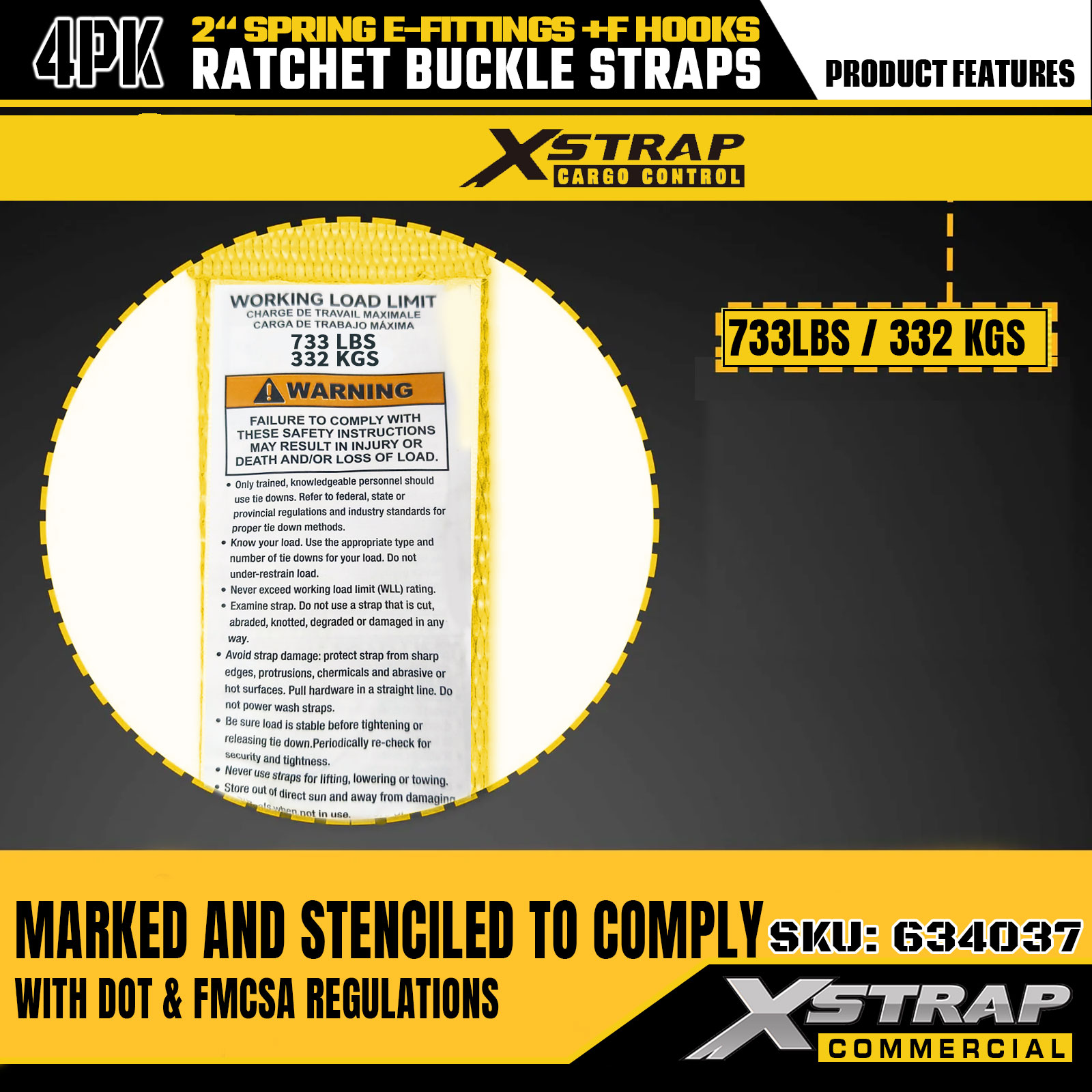 - Marquages clairs de capacité de charge : chaque sangle est clairement étiquetée avec une charge de travail sûre (SWL) de 733 lb et une résistance à la rupture de 2199 lb, fournissant ainsi des directives de sécurité essentielles pour garantir un contrôle approprié et sécurisé du chargement.