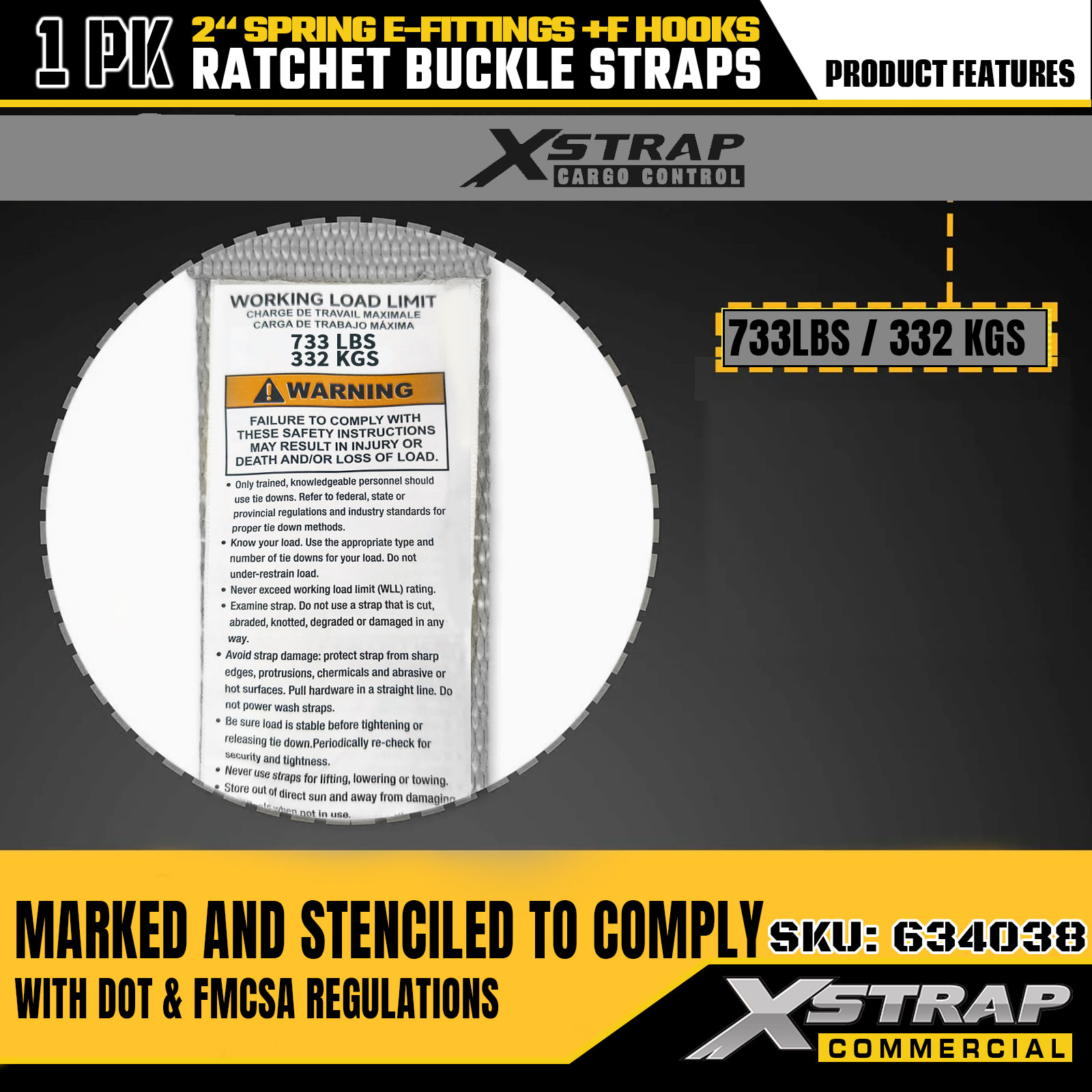 - Étiquettes d'identification claires de la limite de charge : chaque sangle est clairement marquée avec une charge de travail sûre (SWL) de 733 lb et une résistance à la rupture de 332 lb, fournissant des conseils de sécurité essentiels pour un contrôle standardisé et sécurisé du fret.