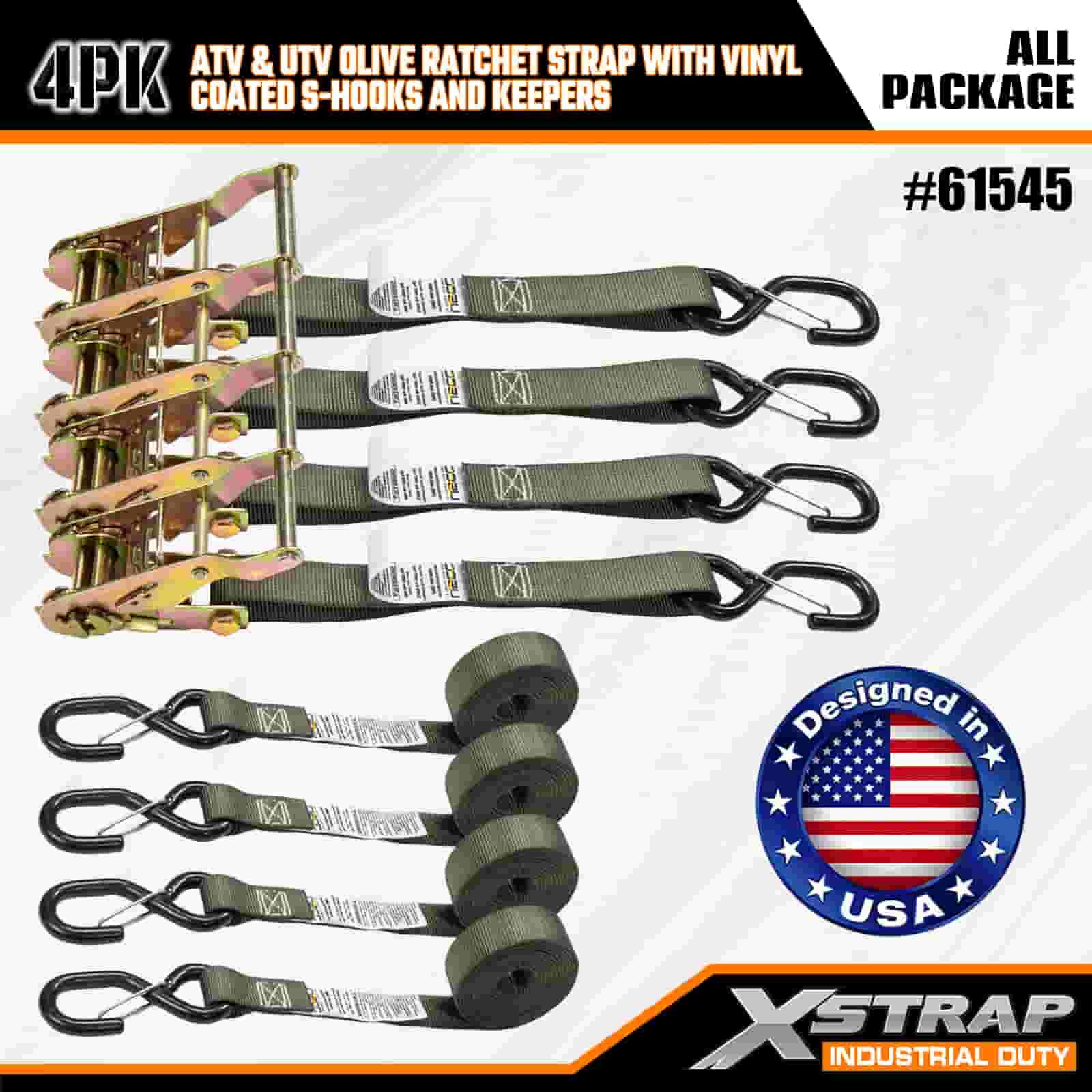Xstrap 4PK Sangle à cliquet avec crochets de sécurité en S recouverts de vinyle, sangle d'arrimage en polyester de 2,5 cm x 2,4 m, sangle d'arrimage à cliquet d'une capacité de 833 lb, sangles de sécurité avec crochets de sécurité en S pour remorque robuste, remorque à plateau plat, bateau de ski, petite voiture, équipement lourd.