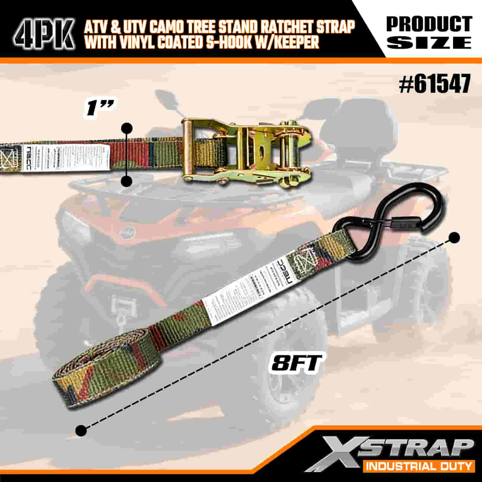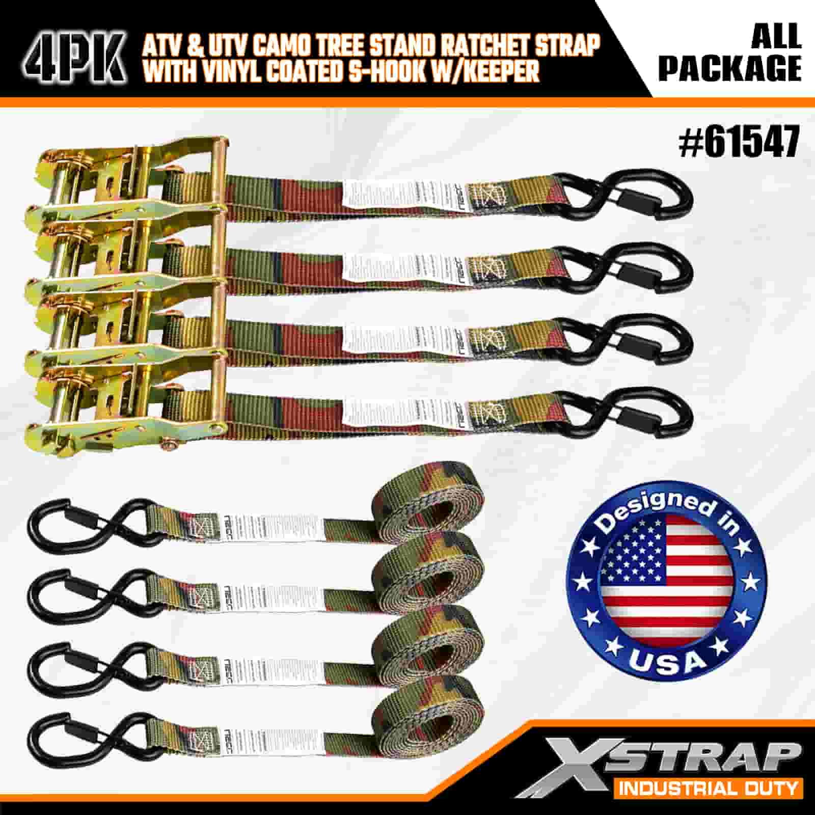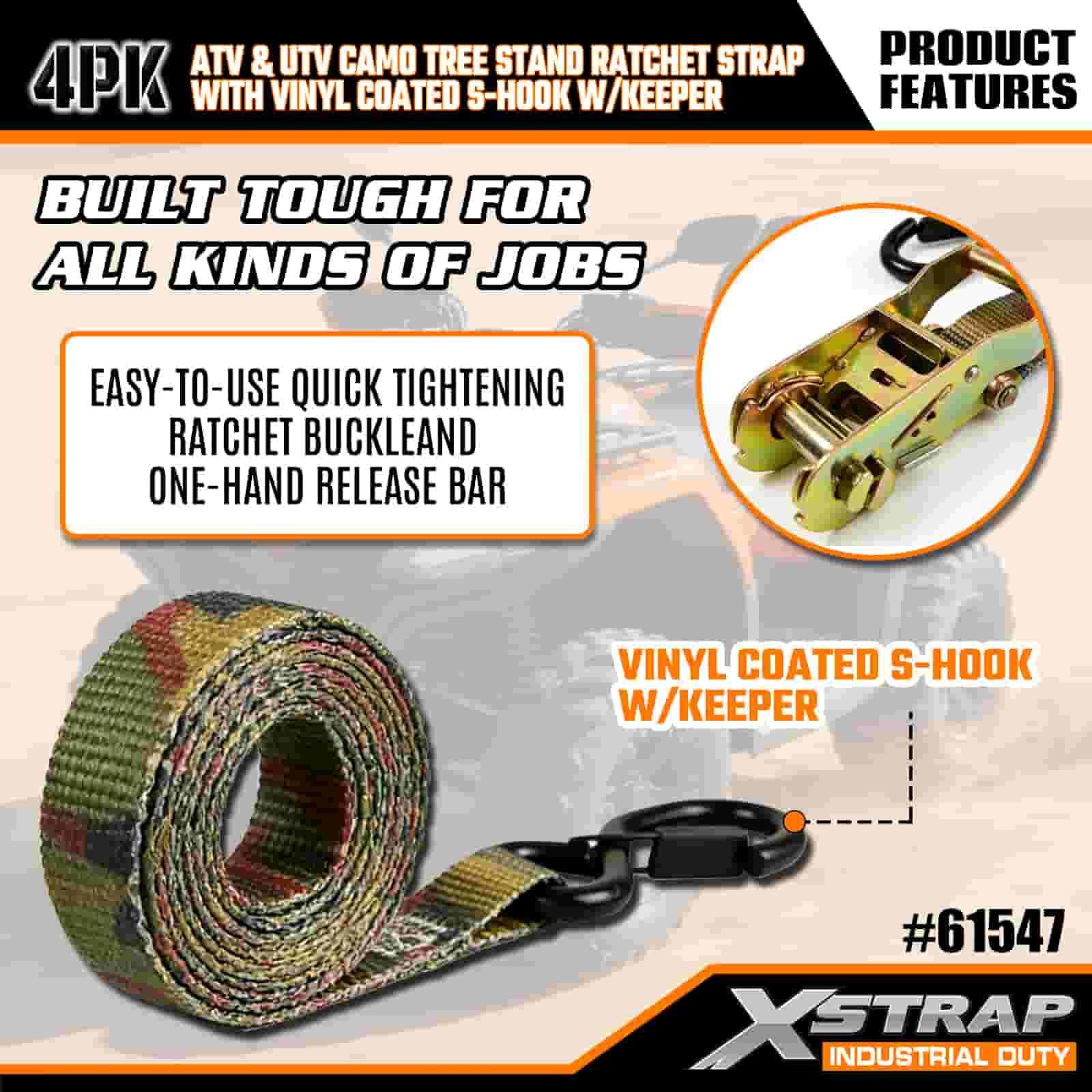 Xstrap 4PK Sangle à cliquet avec crochets de sécurité en S recouverts de vinyle, sangle d'arrimage en polyester de 2,5 cm x 2,4 m, sangles d'arrimage à cliquet d'une capacité de 400 lb avec crochets de sécurité en S pour remorque, remorque à plateau plat, bateau de ski, petite voiture, équipement lourd.