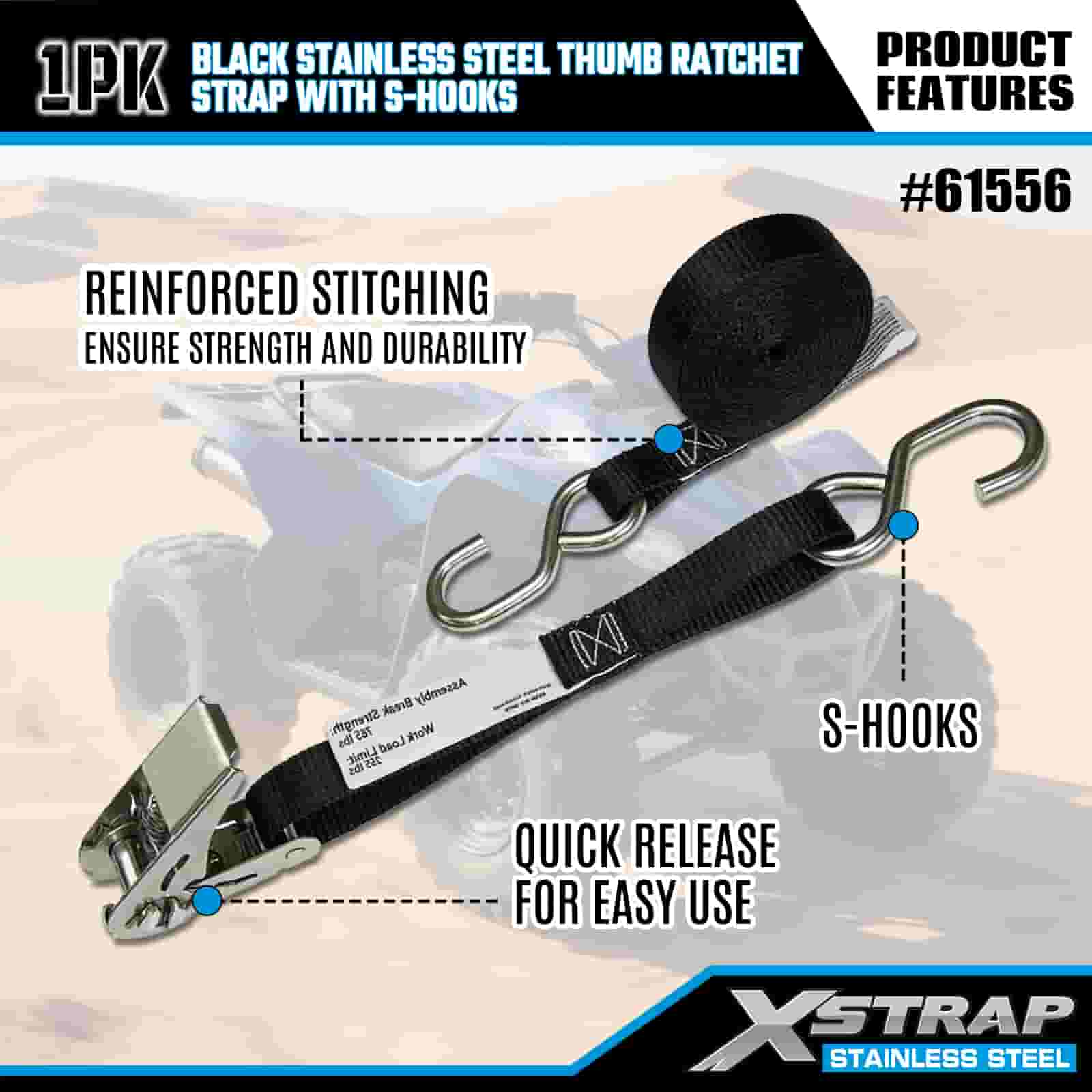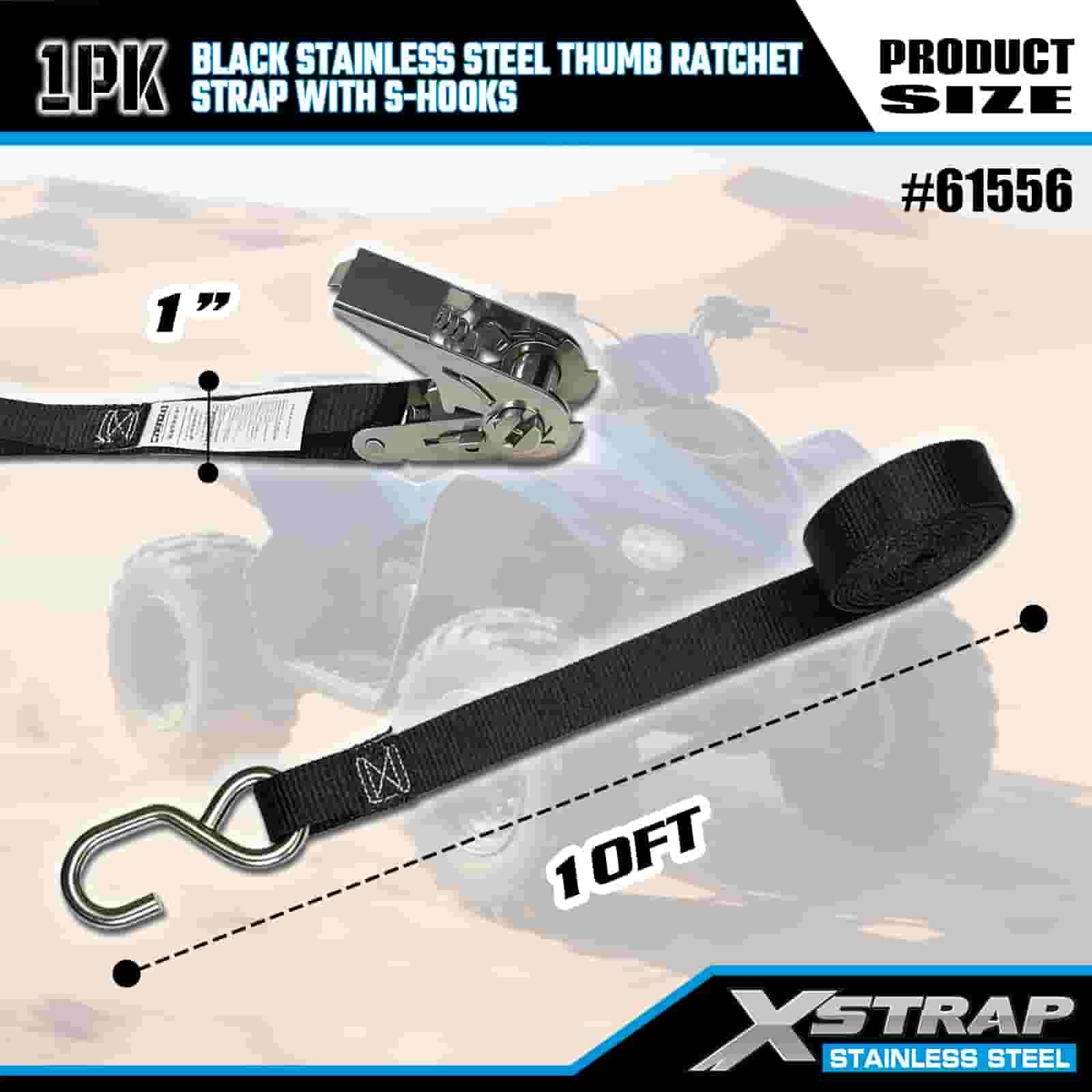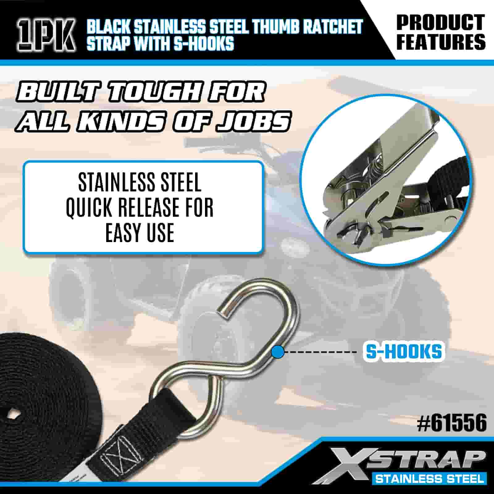 Xstrap Cliquet à pouce en acier inoxydable noir avec crochets en S, sangle d'arrimage en polyester de 1" x 10', sangles d'arrimage à cliquet d'une capacité de 255 lb avec crochets en S pour remorque, remorque à plateau, bateau de ski, petite voiture, équipement lourd.