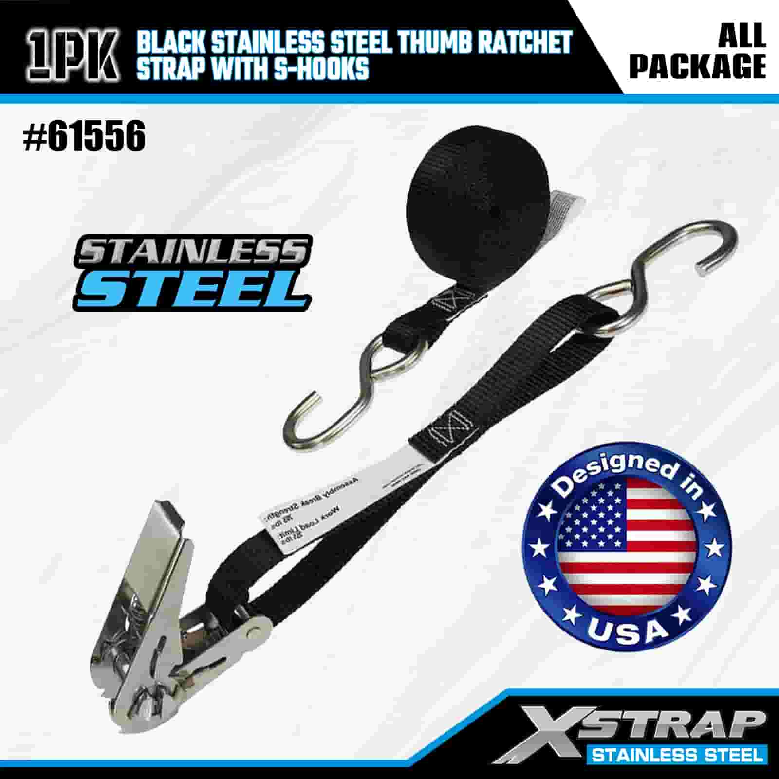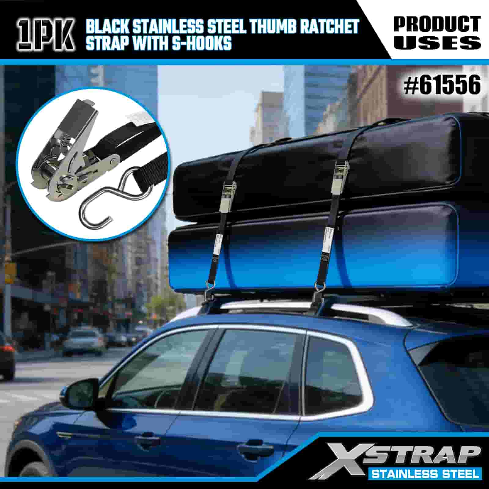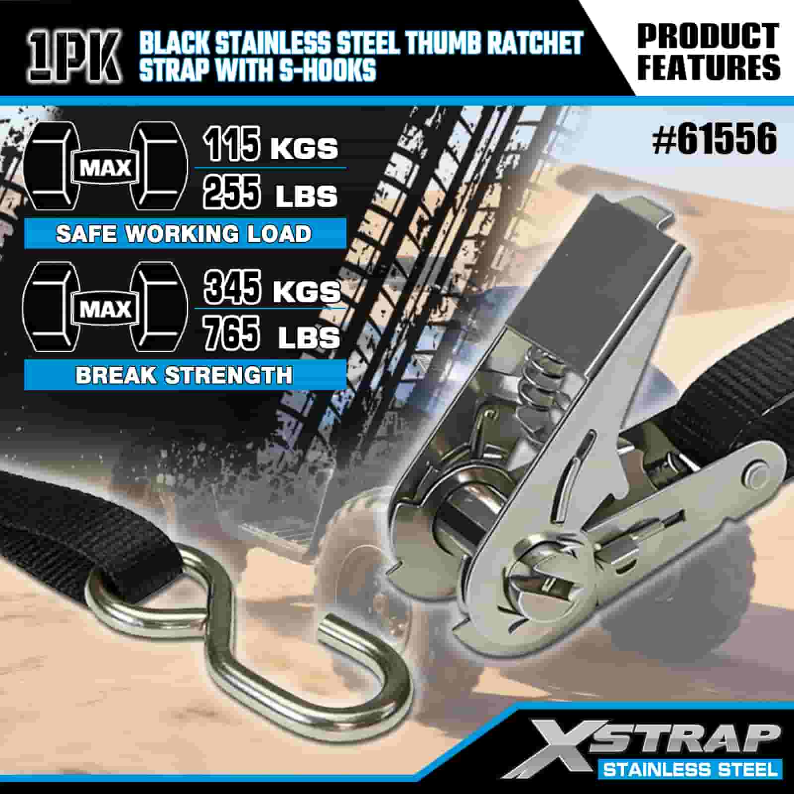 Xstrap Cliquet à pouce en acier inoxydable noir avec crochets en S, sangle d'arrimage en polyester de 1" x 10', sangles d'arrimage à cliquet d'une capacité de 255 lb avec crochets en S pour remorque, remorque à plateau, bateau de ski, petite voiture, équipement lourd.