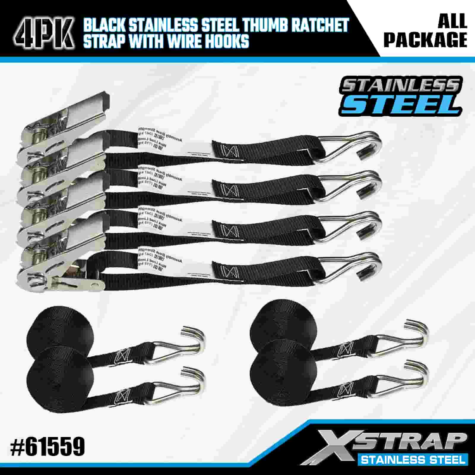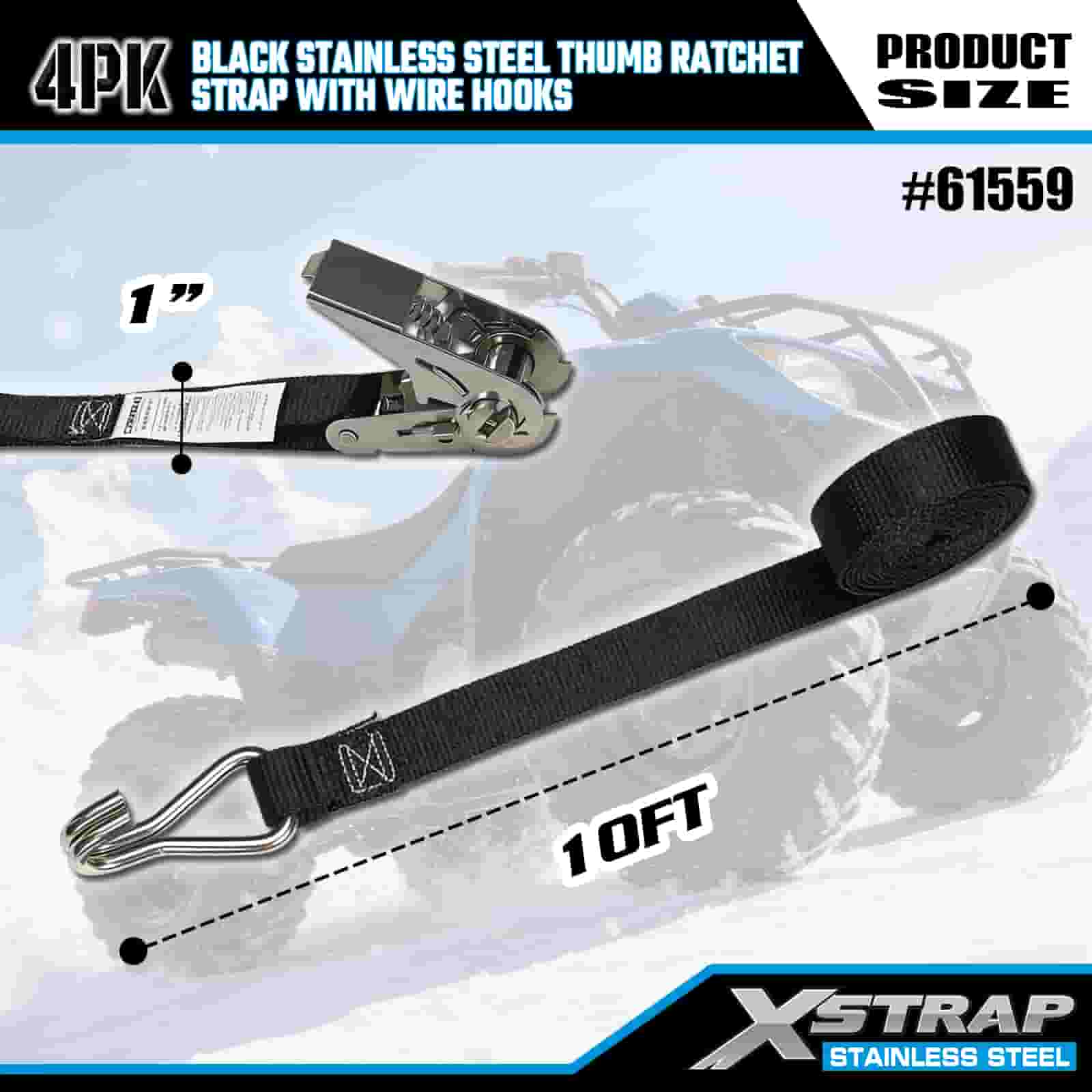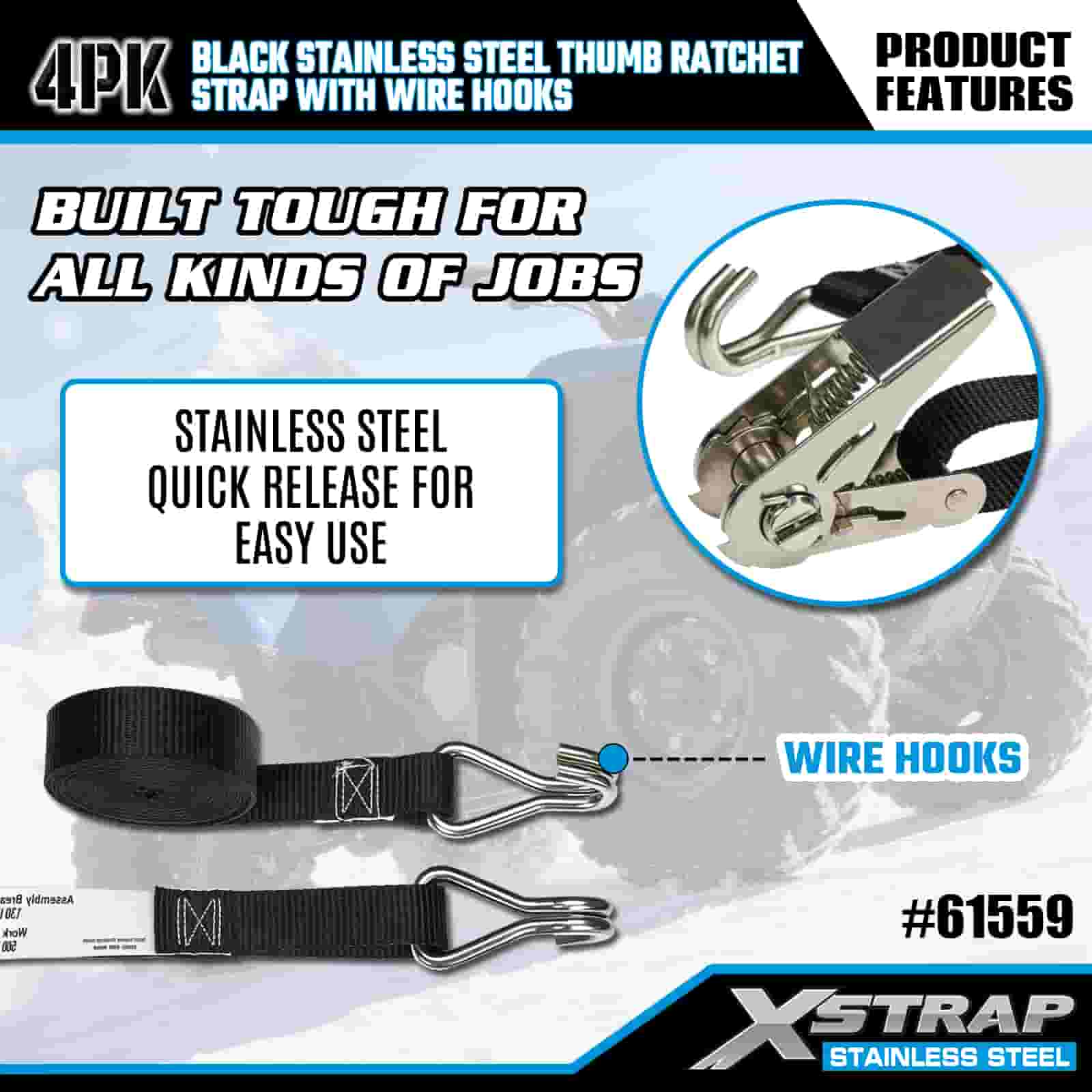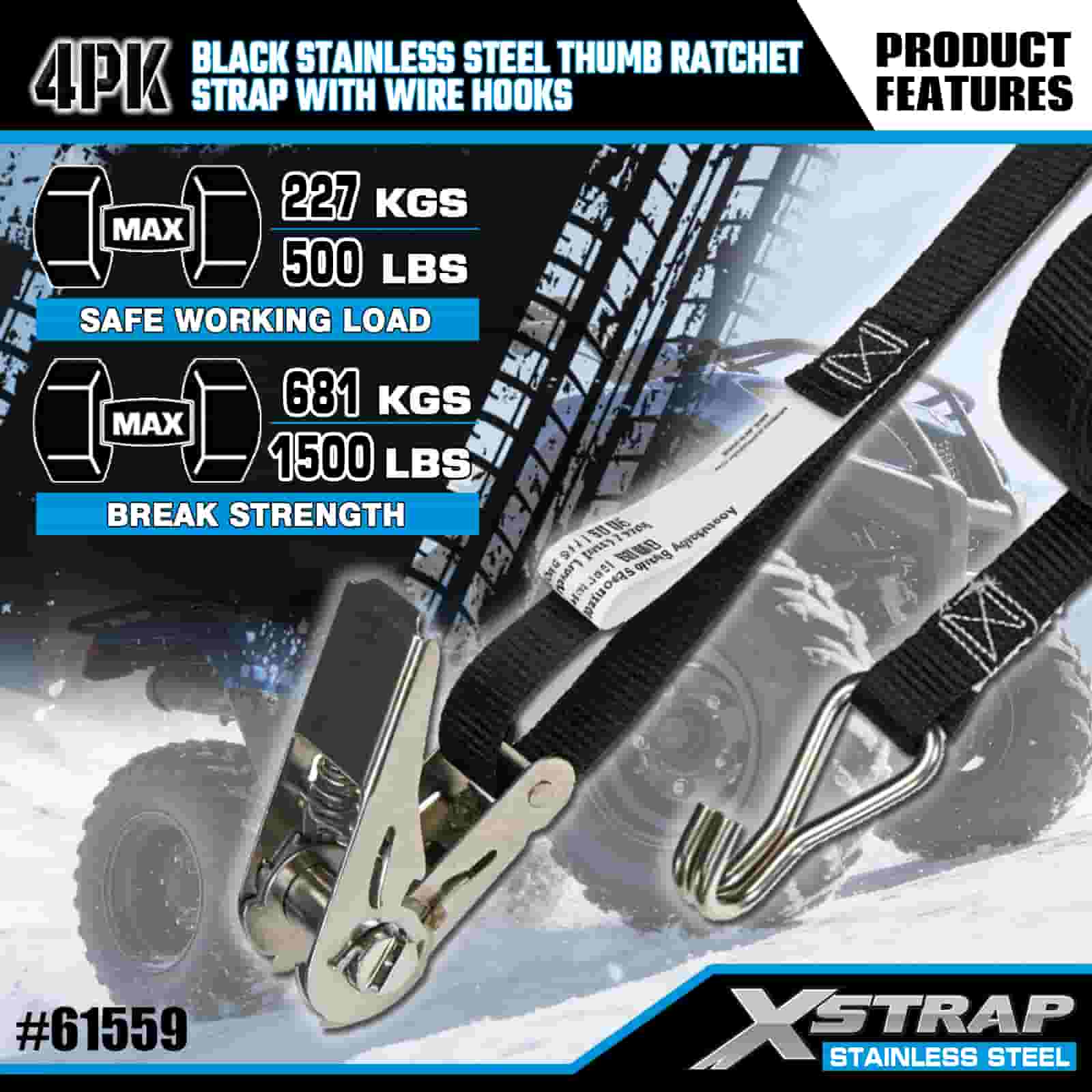 Xstrap Lot de 4 cliquets à pouce en acier inoxydable noir avec crochets métalliques, sangle d'arrimage en polyester de 2,5 x 3 m, capacité de 226,8 kg, sangles de fixation avec crochets métalliques pour remorque, remorque à plateau plat, bateau de ski, petite voiture, équipement lourd.