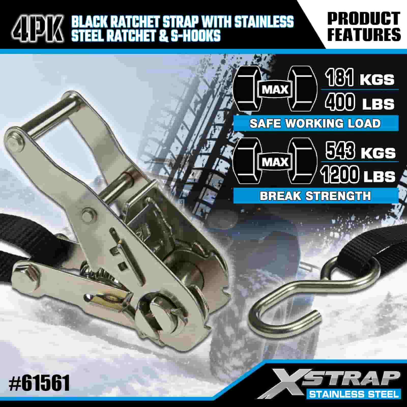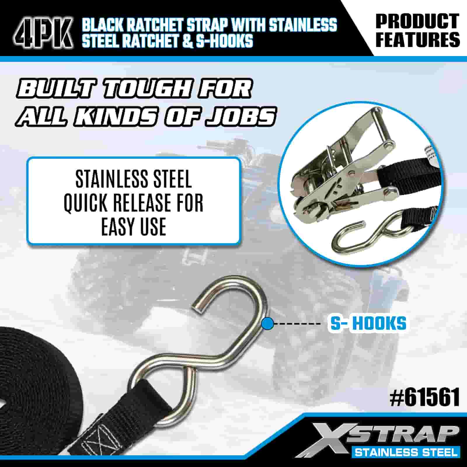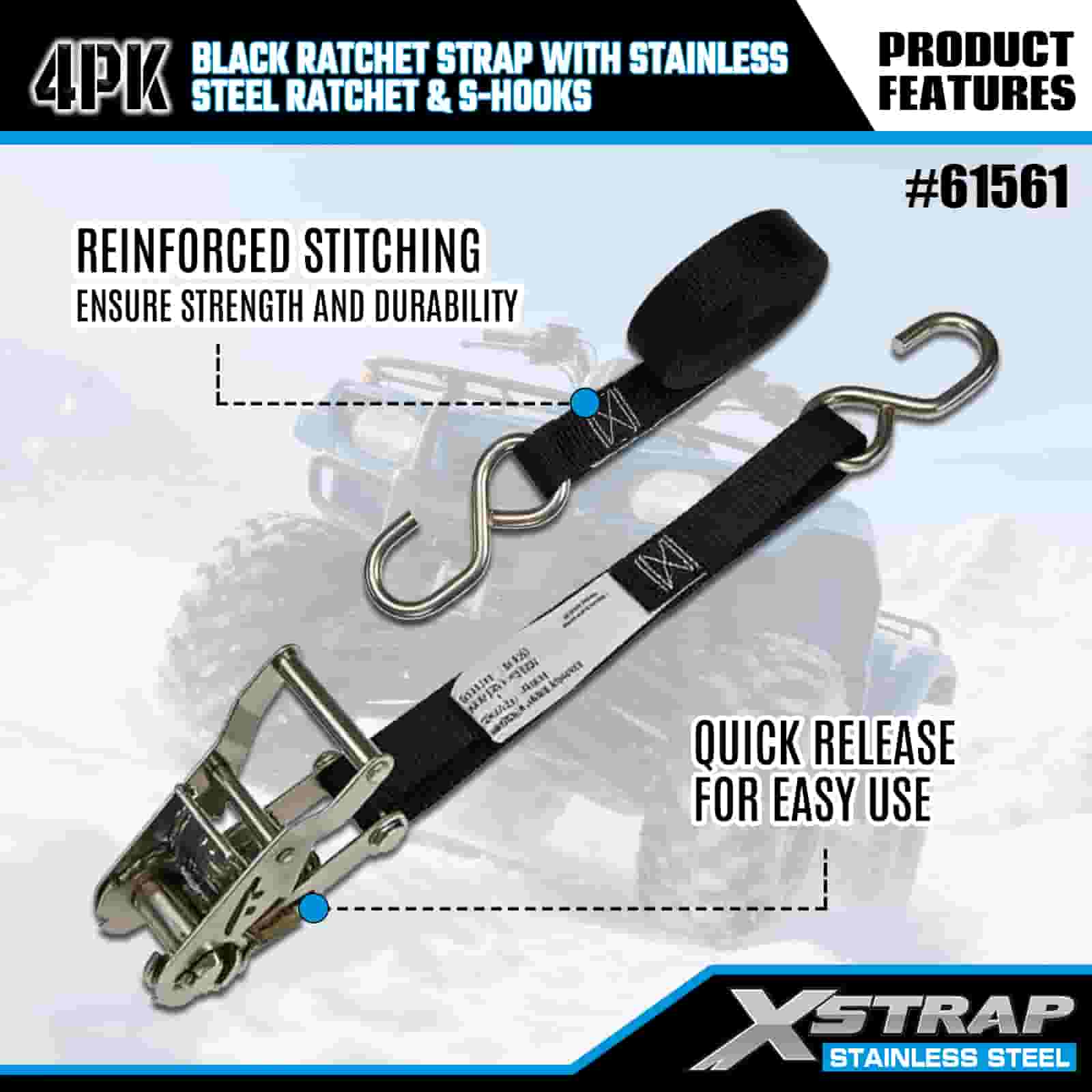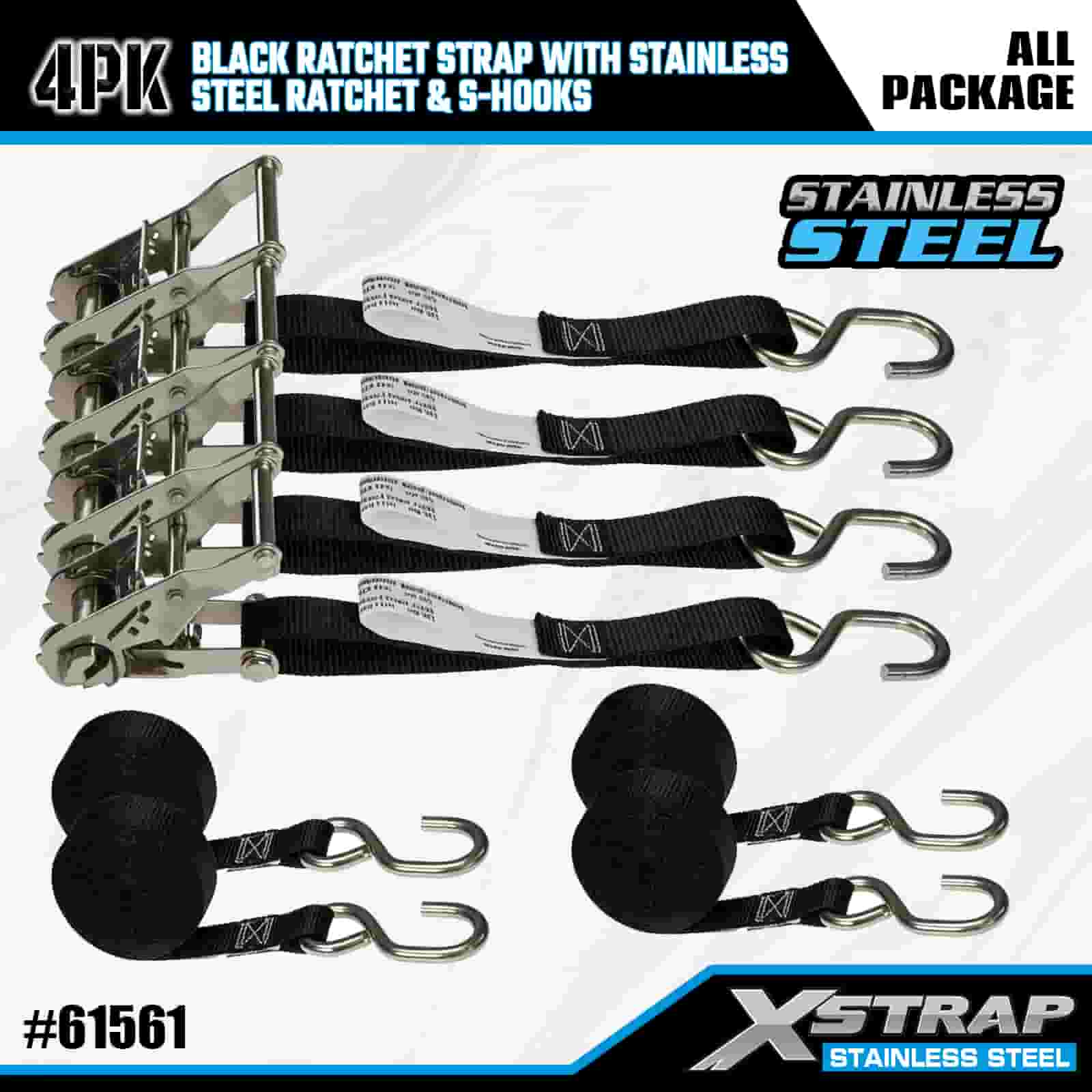 Xstrap 4PK Sangle à cliquet noire avec cliquet en acier inoxydable et crochets en S, sangle d'arrimage en polyester de 2,5 cm x 1,8 m, sangle d'arrimage à cliquet d'une capacité de 400 lb, sangles de sécurité avec crochets en S pour remorque, remorque à plateau plat, bateau de ski, petite voiture, équipement lourd.
