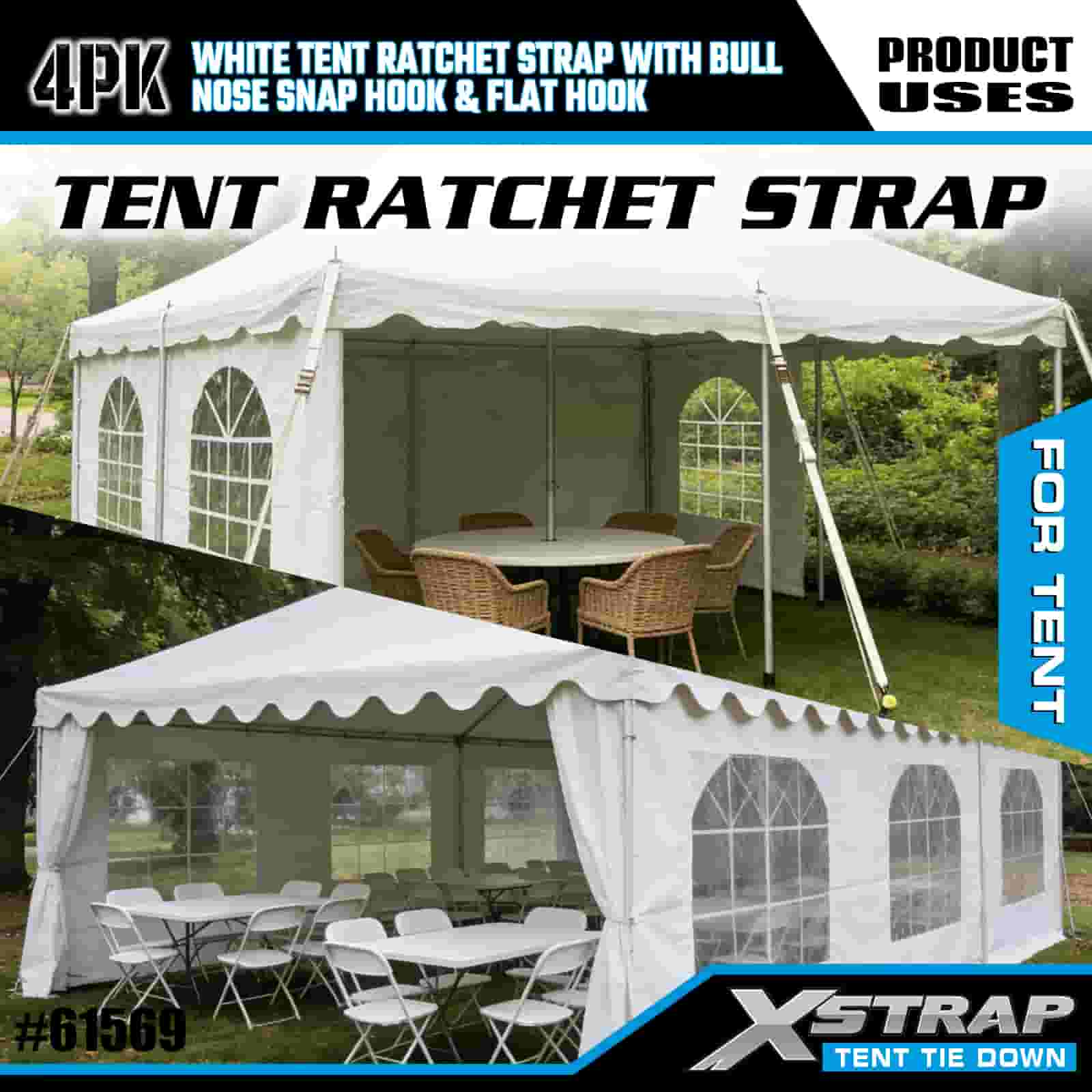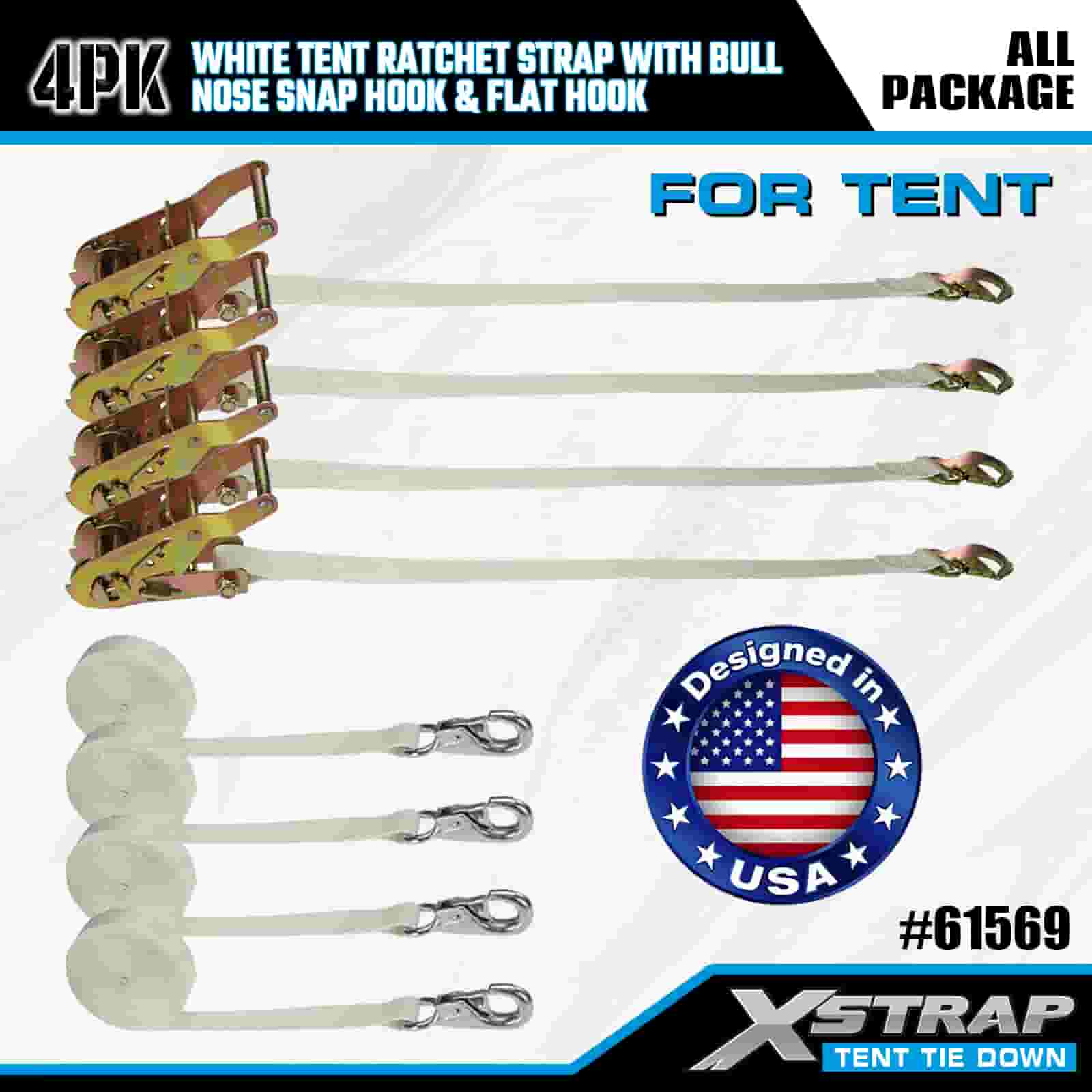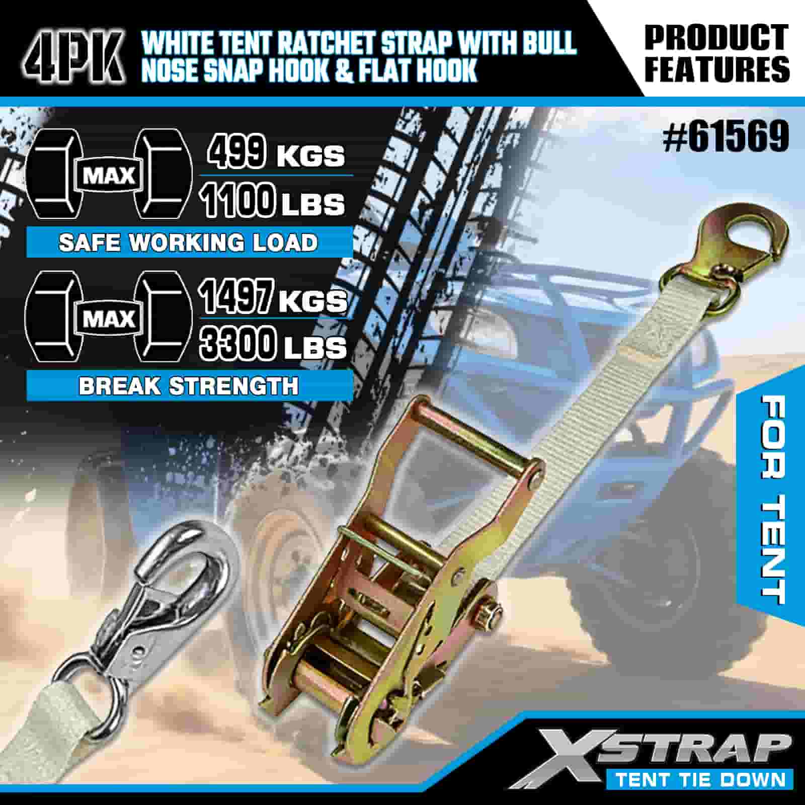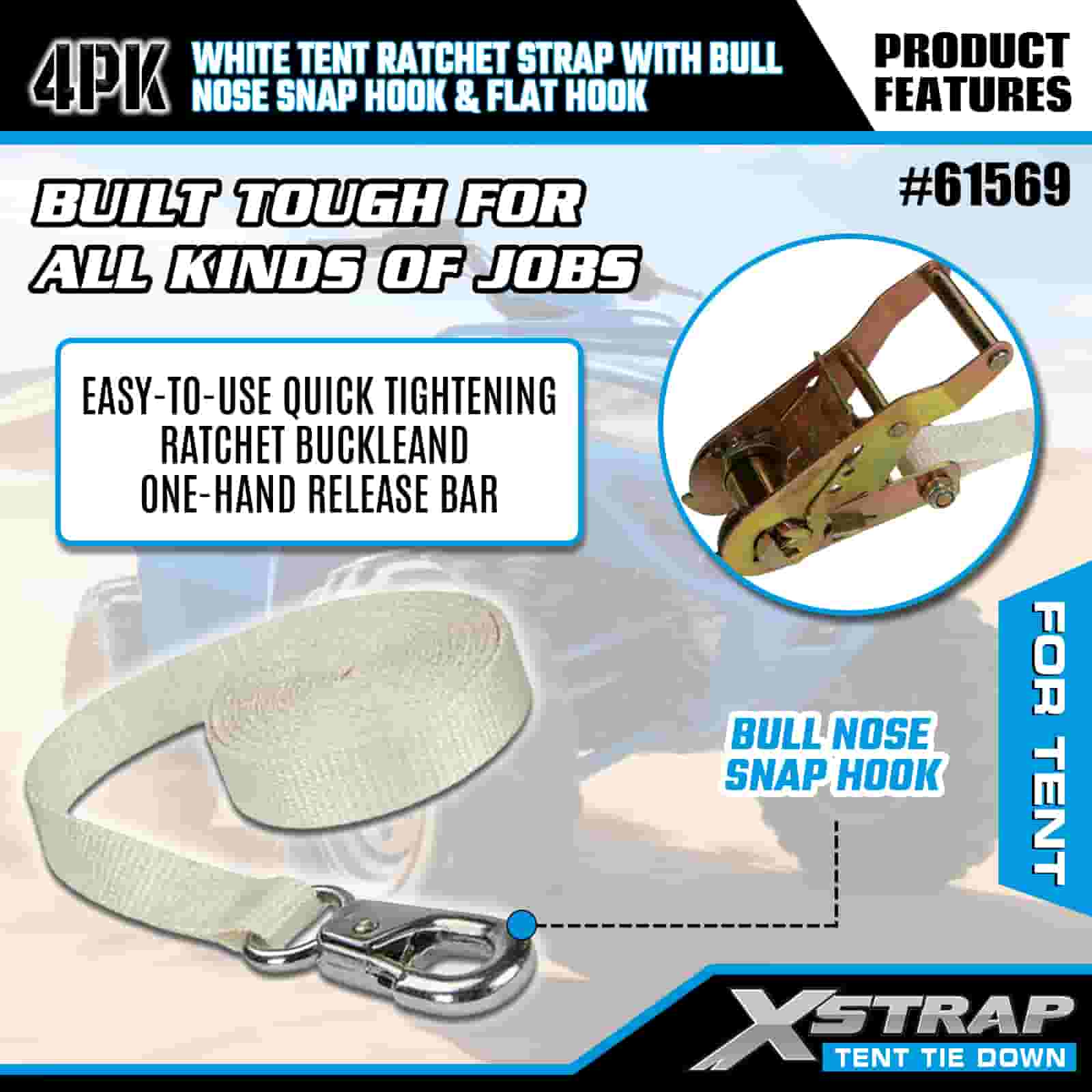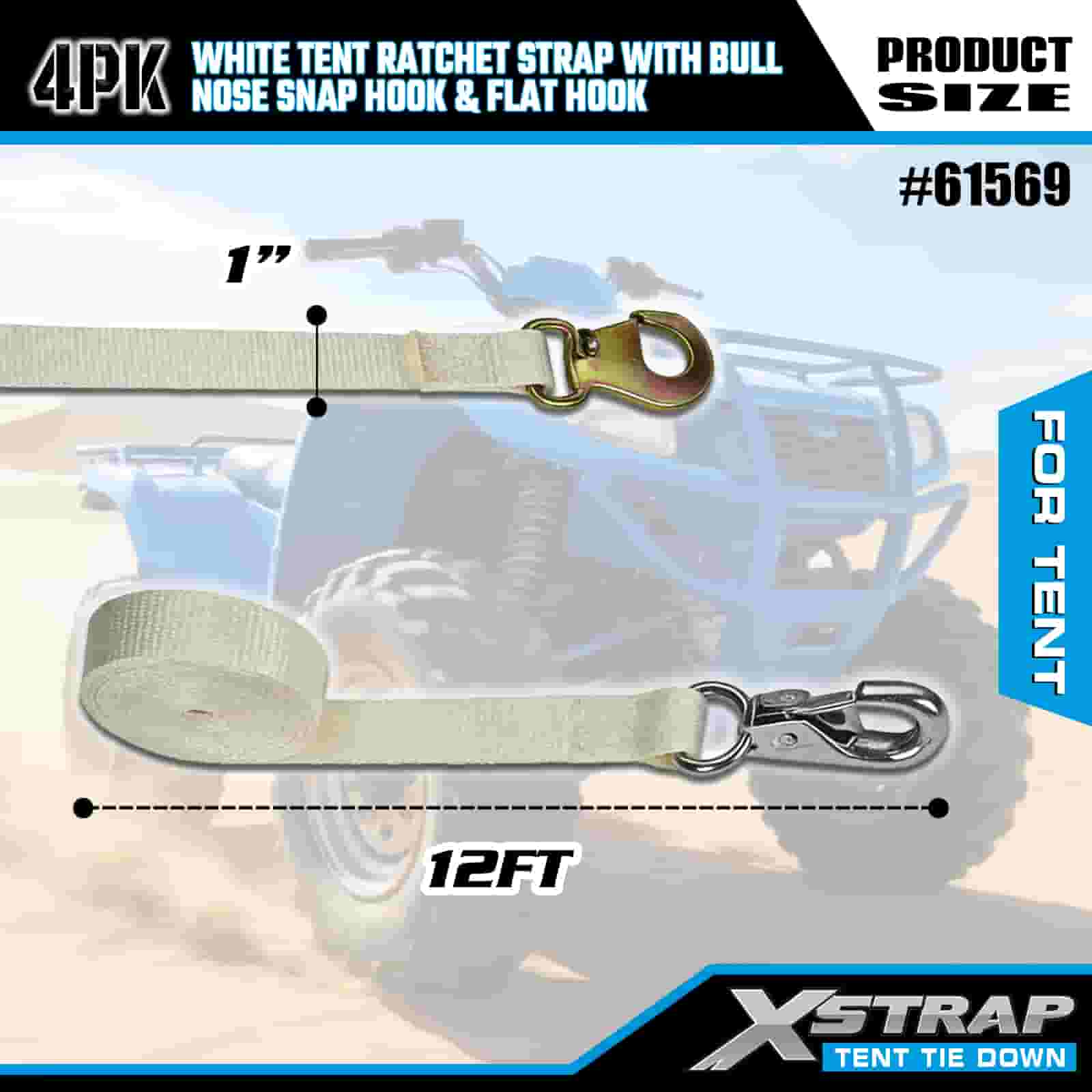 Xstrap 4PK Sangle à cliquet de tente blanche avec mousqueton à nez de taureau et crochet plat, sangle d'arrimage en polyester de 1" x 12', sangle à cliquet d'une capacité de 1100 lb, sangles de sécurité avec mousqueton à nez et crochet plat pour le contrôle du chargement, fixation de tente.
