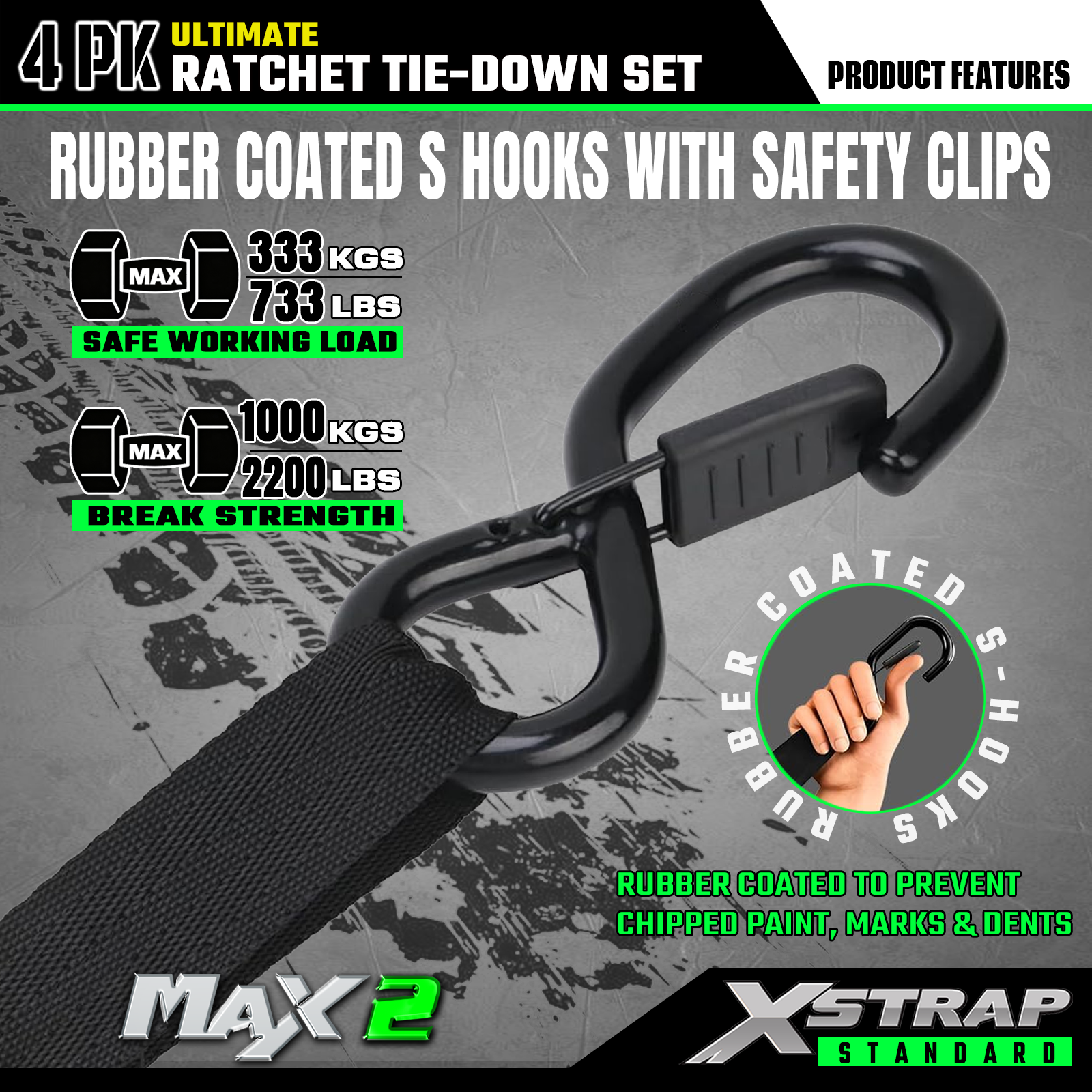 Il s'agit de nos 4 sangles d'arrimage pour moto de 1 pouce 15 pieds avec crochets de sécurité. La force de rupture est de 2 200 livres. Il y a également 4 boucles souples dans cet ensemble.