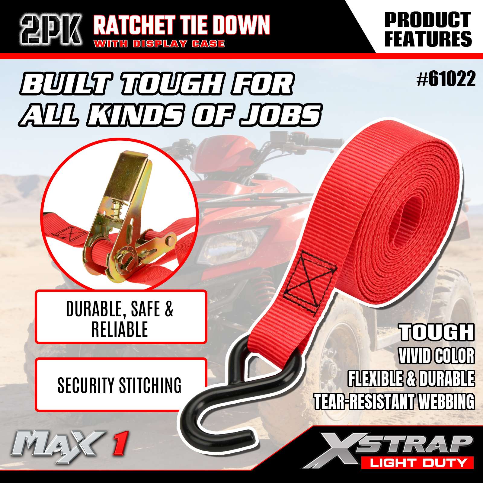 Les sangles d'arrimage à cliquet Xstrap 2PK mesurent 1 po x 10 pi, la charge de travail sûre est de 300 lb et la résistance à la rupture est de 900 lb.