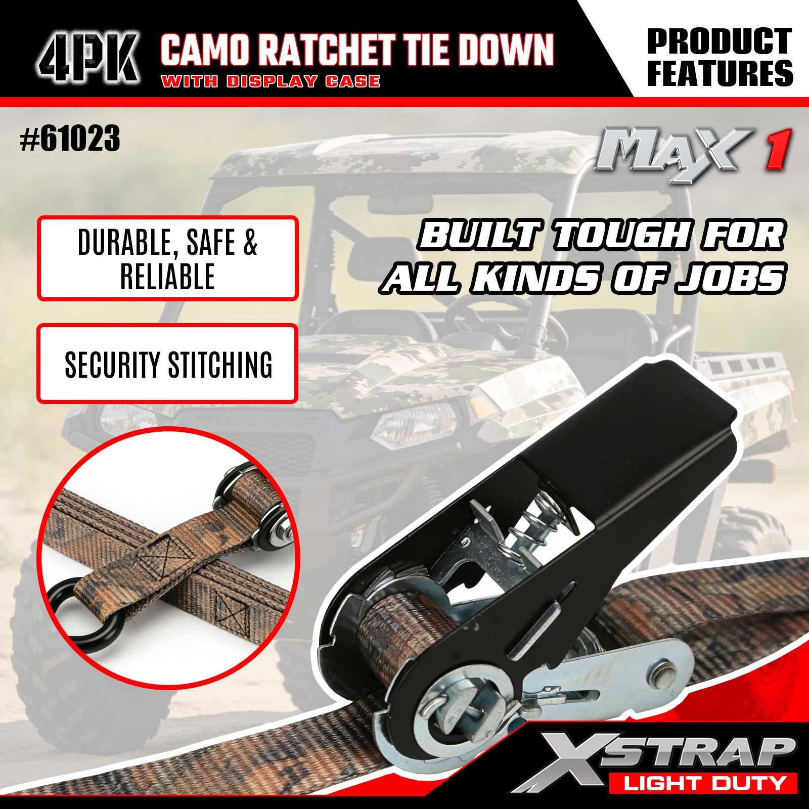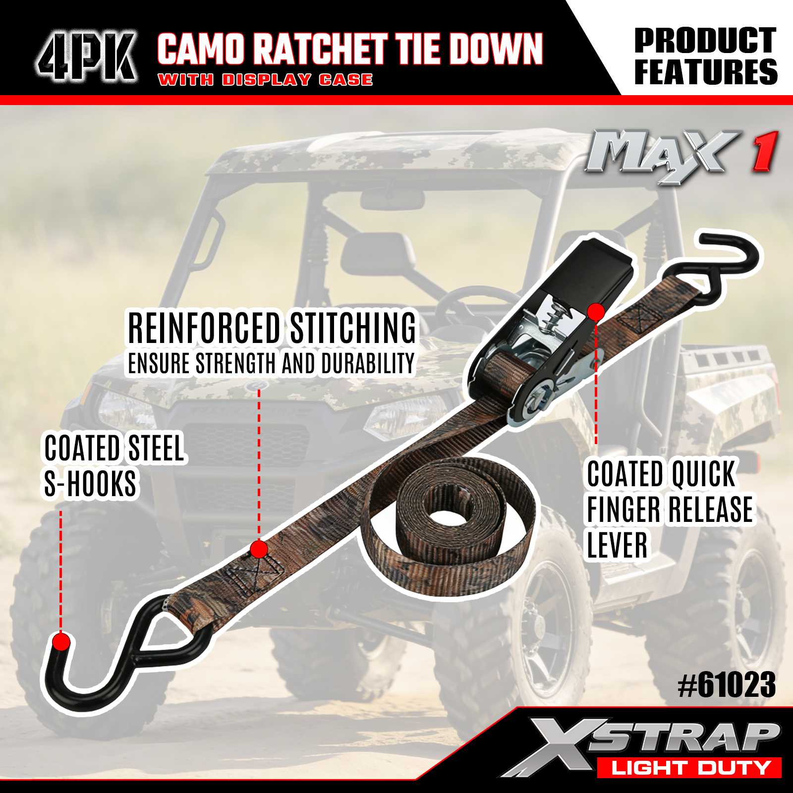 Les sangles d'arrimage à cliquet Xstrap 4PK CAMO mesurent 1 po x 10 pi, la charge de travail sûre est de 300 lb et la résistance à la rupture est de 900 lb.