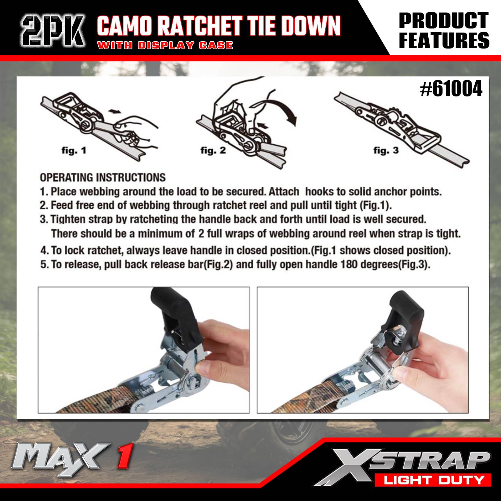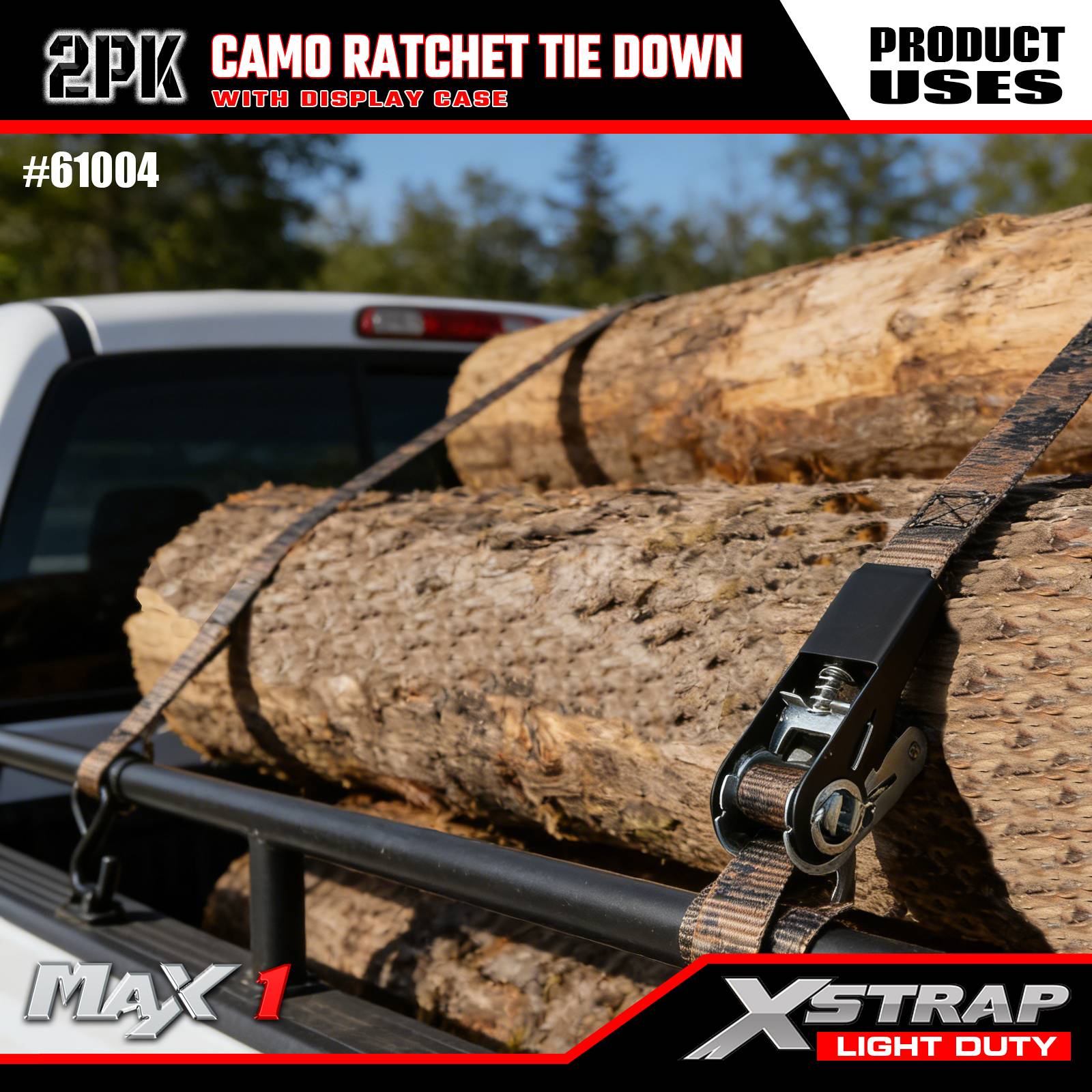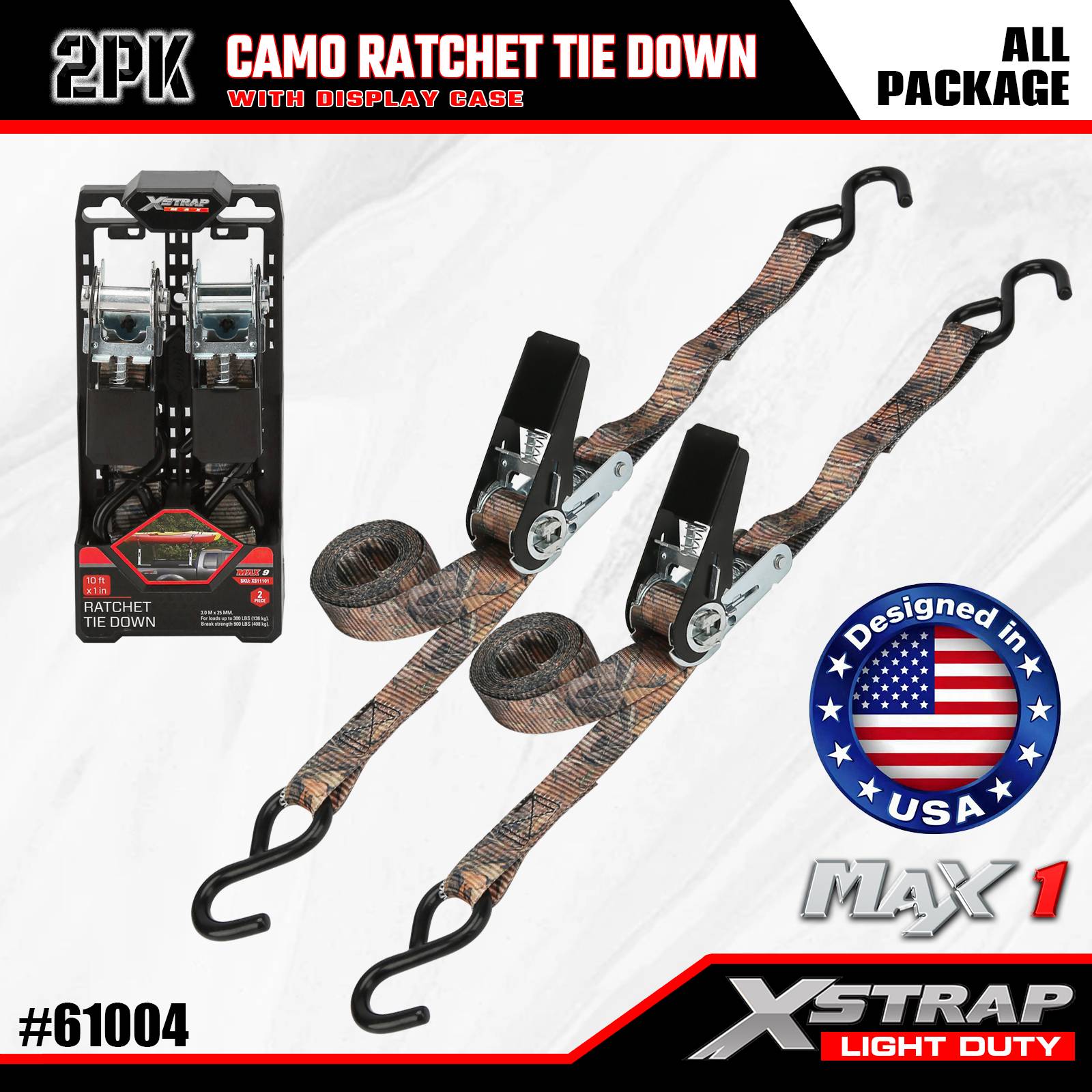 Xstrap Lot de 2 sangles d'arrimage à cliquet, 2,5 x 3 m - Capuchon de charge de 300 lb - Résistance à la rupture de 900 lb - Sangles de chargement pour appareils mobiles, équipement de pelouse, moto, camouflage