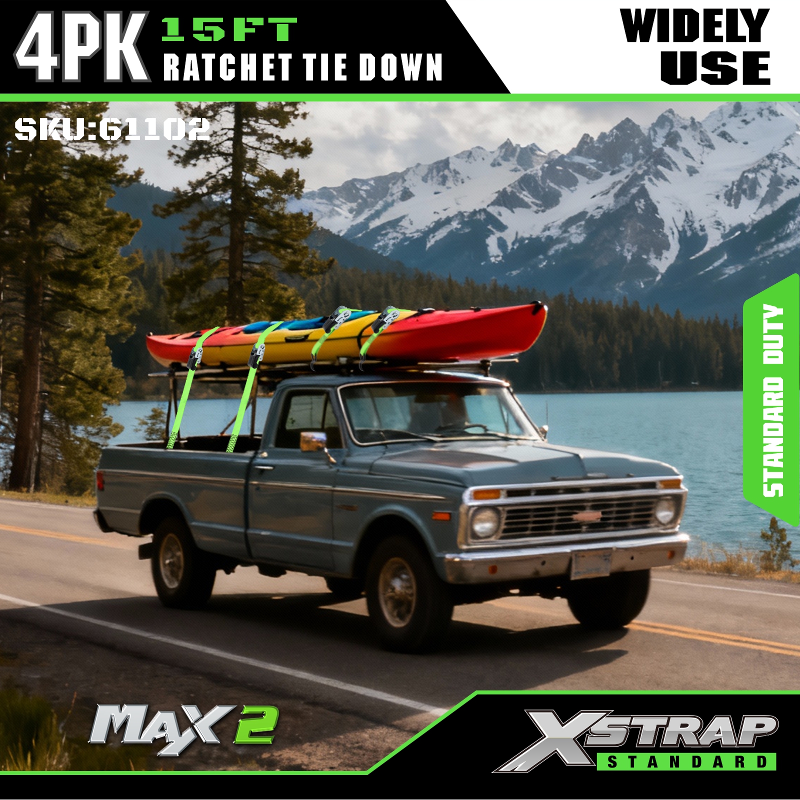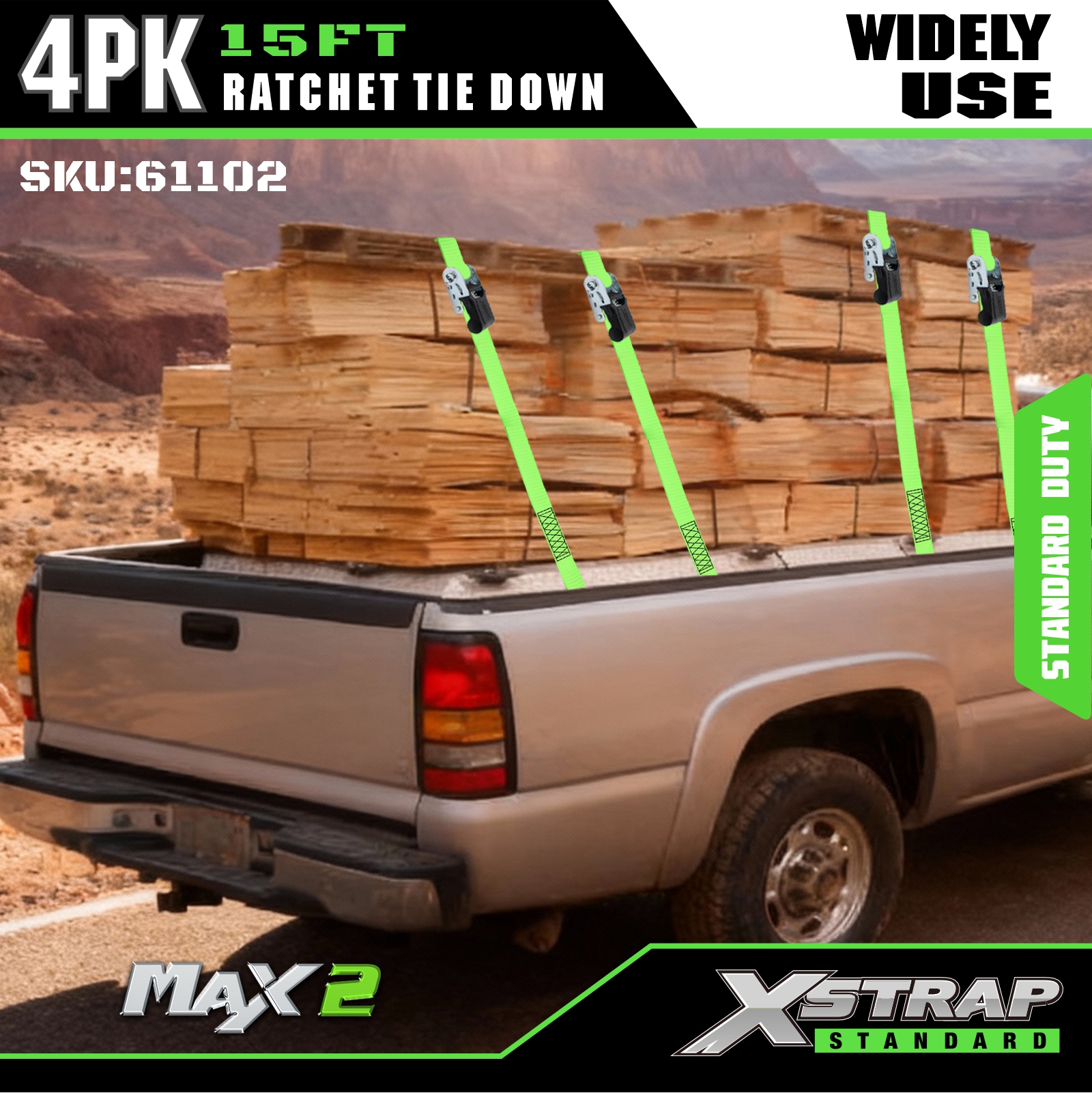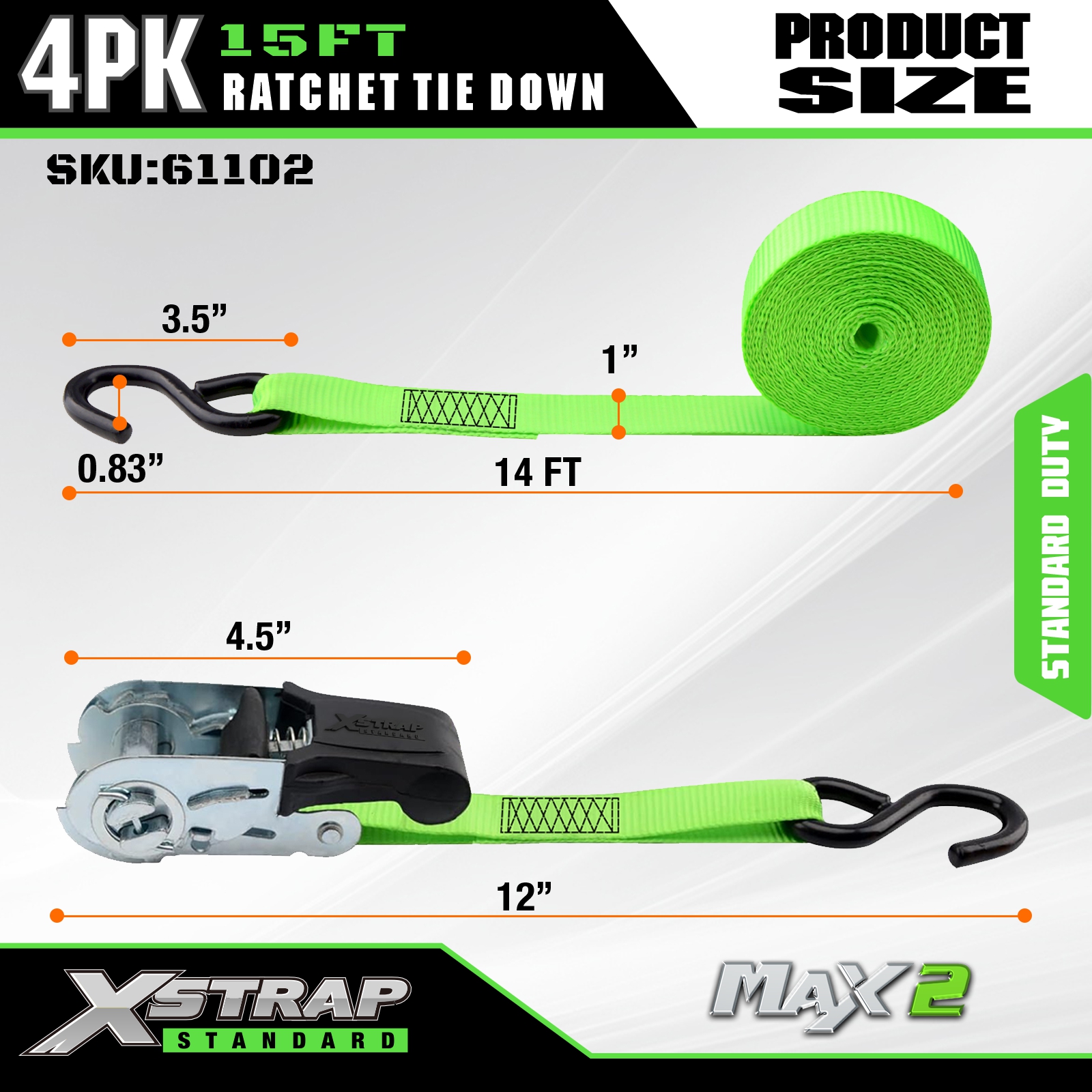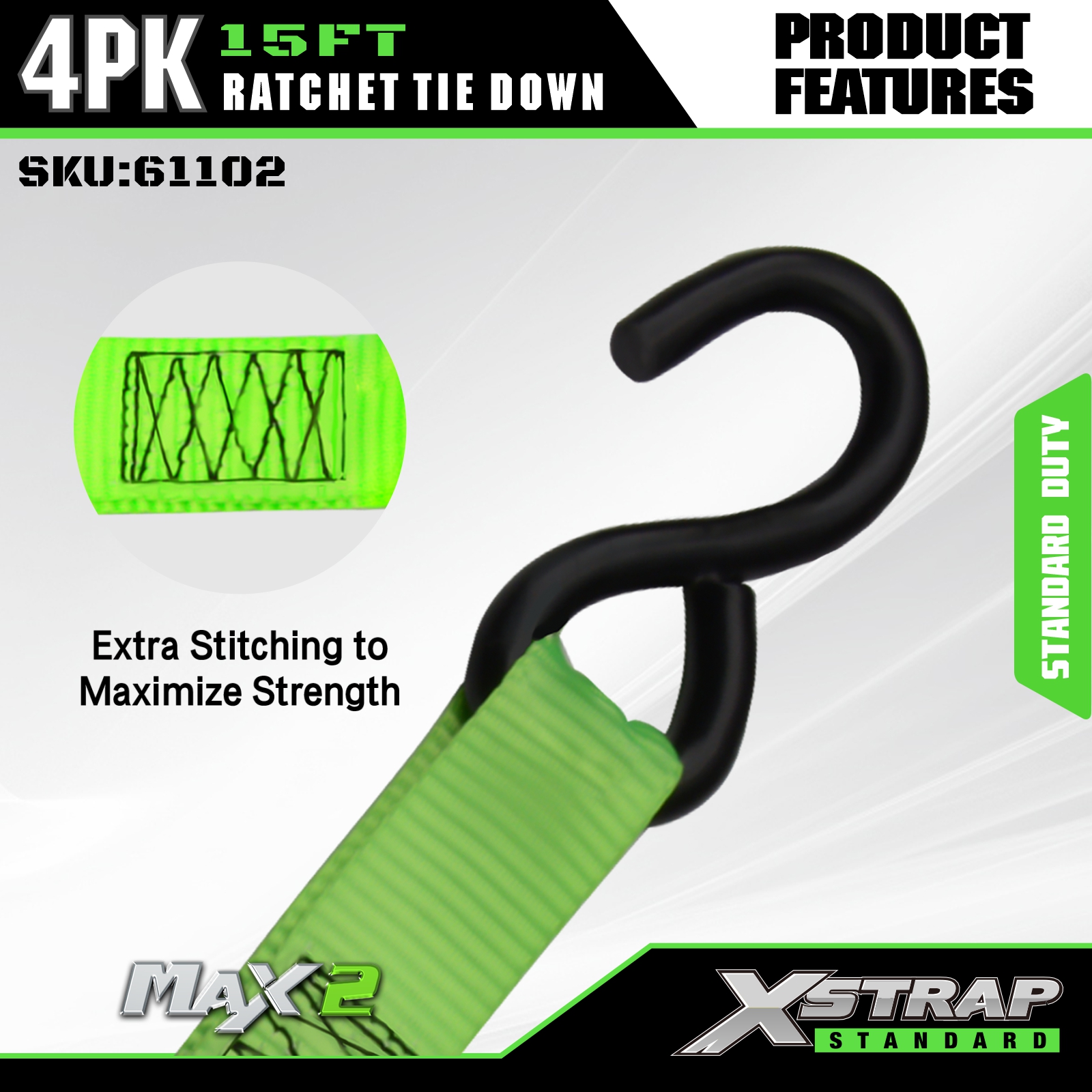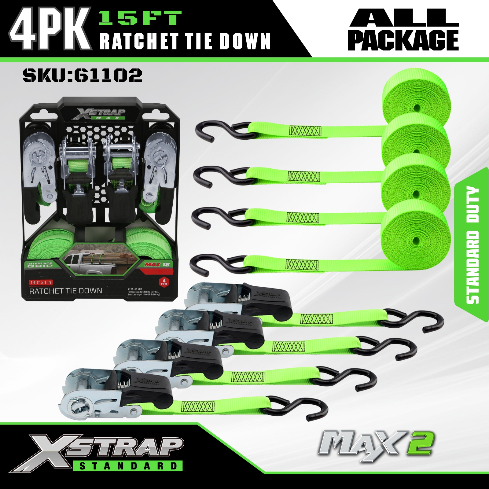 Xstrap Lot de 4 sangles d'arrimage à cliquet 4,5 m - Capacité de charge de 226,8 kg - Résistance à la rupture de 1 500 kg - Sangles de chargement pour appareils mobiles, équipement de pelouse, moto