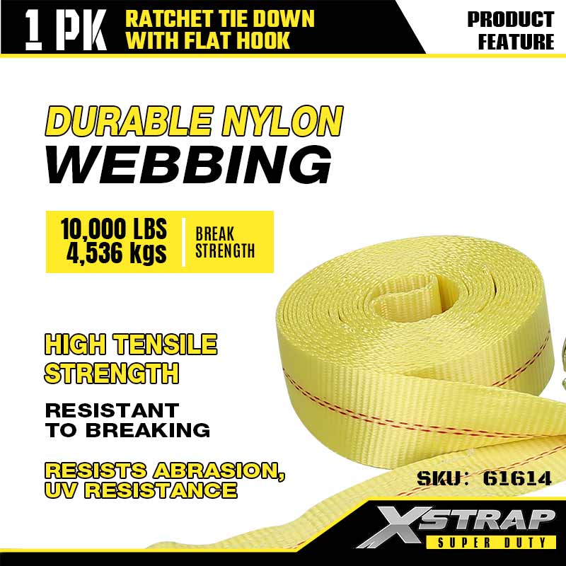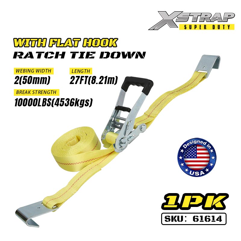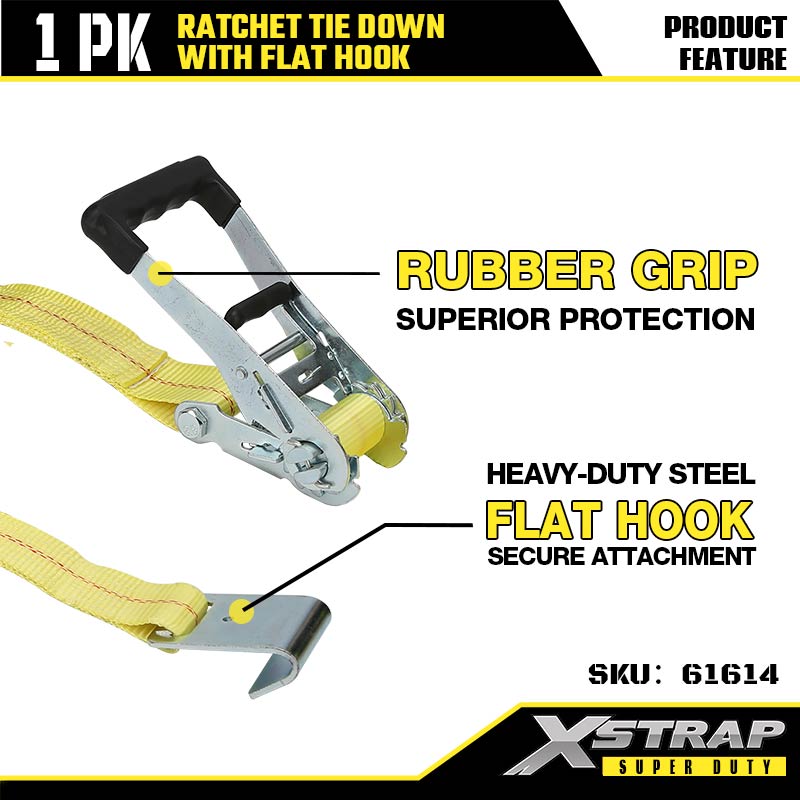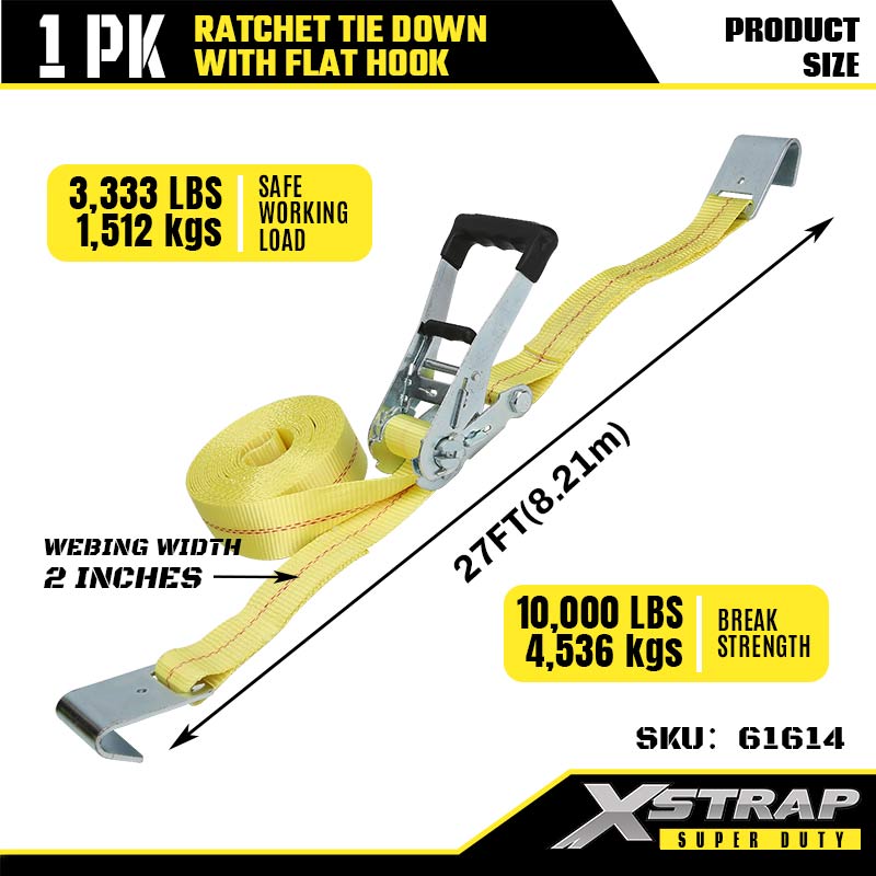 Xstrap Ratcet Arrimage avec crochets plats, sangle d'arrimage en polyester de 2" x 27', sangle à cliquet, capacité de 3333 lb, sangles de sécurité d'arrimage avec crochets plats pour remorque robuste, remorque à lit plat, bateau de ski, petite voiture, équipement lourd.