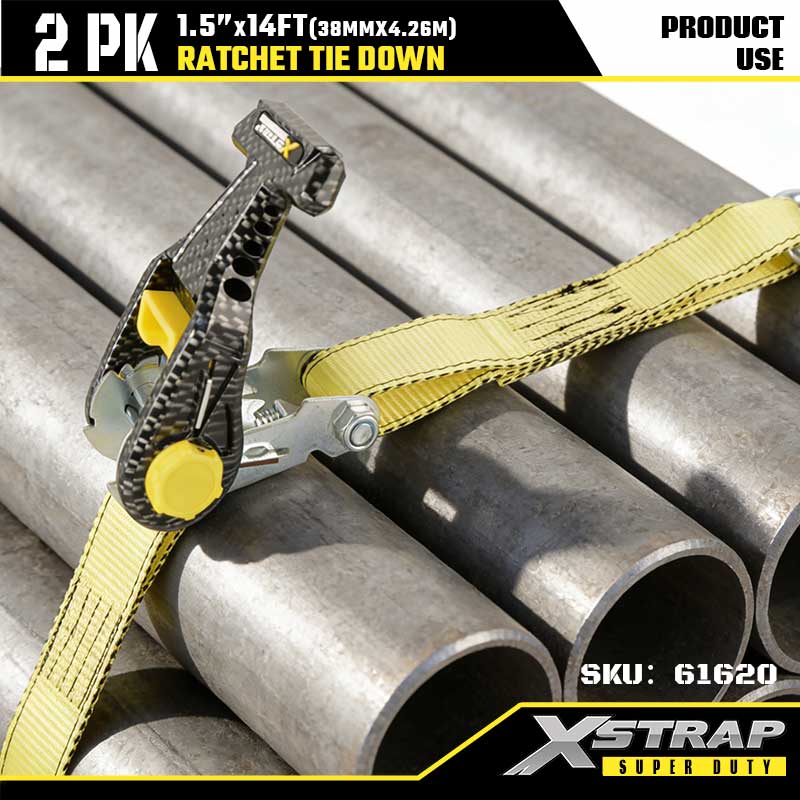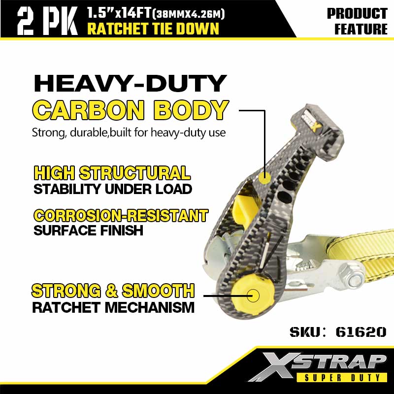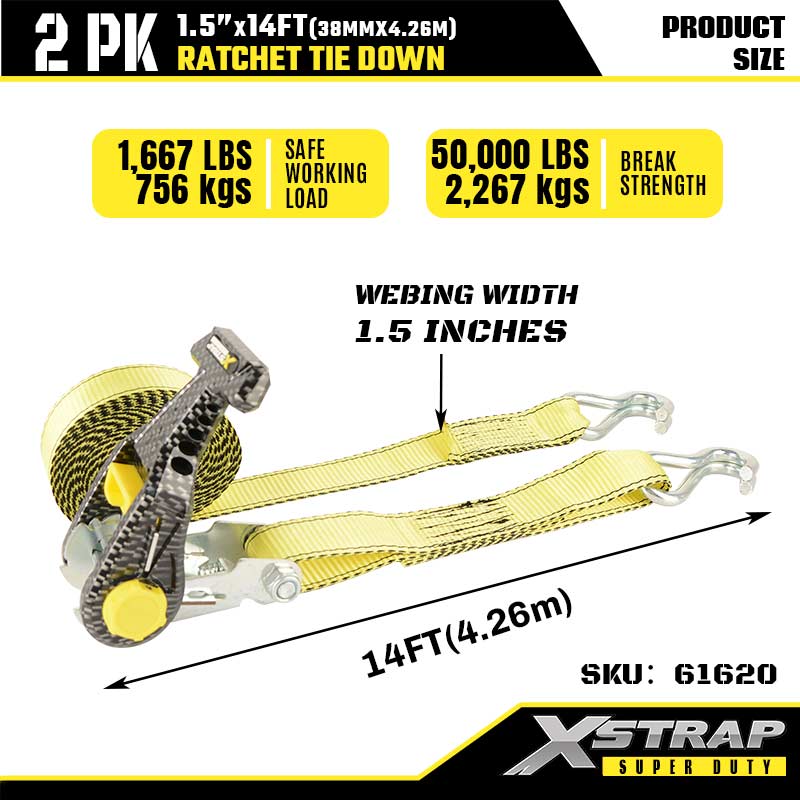 Xstrap 2PK d'arrimage à cliquet avec crochets doubles en J, sangle d'arrimage en polyester de 1-1/2" x 14', sangle à cliquet, capacité de 1667 lb, sangles de sécurité avec crochets doubles en J pour remorque robuste, remorque à plateau plat, bateau de ski, petite voiture, équipement lourd.