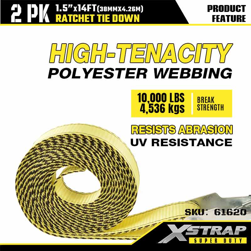 - Sangle en polyester haute ténacité : la sangle en polyester de 1,5 pouce de large utilise un motif tissé noir et jaune pour résister à l'effilochage, à l'étirement et à l'abrasion. Il résiste aux UV et au soleil et à la pluie, il reste donc solide pour une utilisation à long terme sur les chantiers ou sur les routes secondaires.