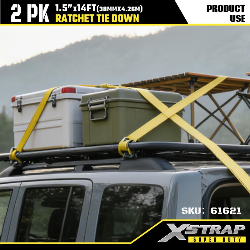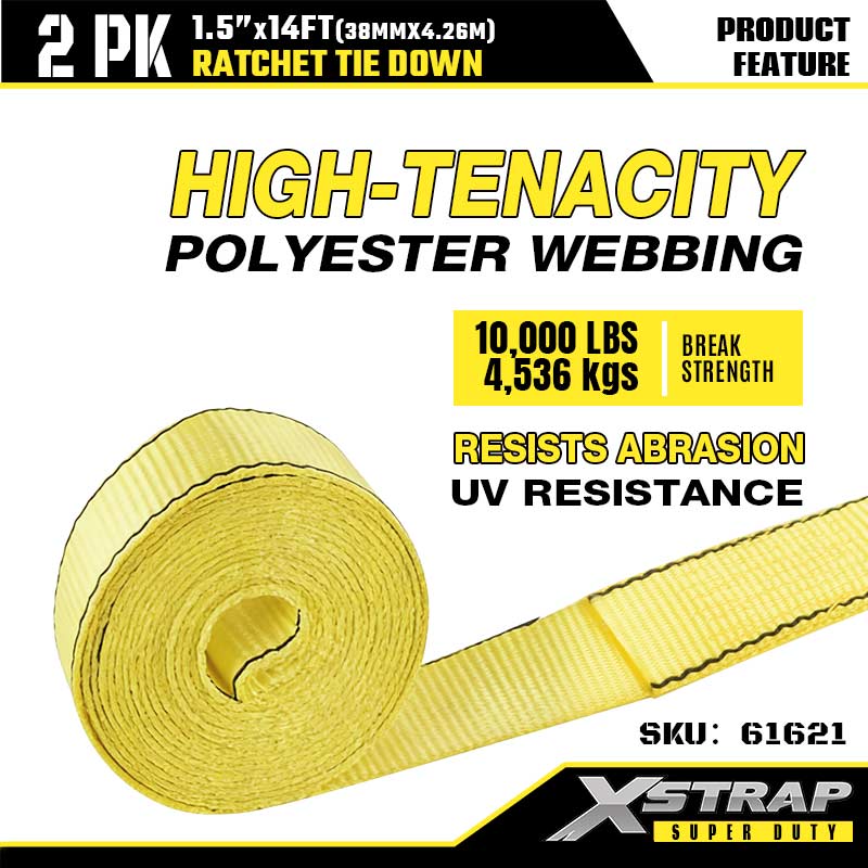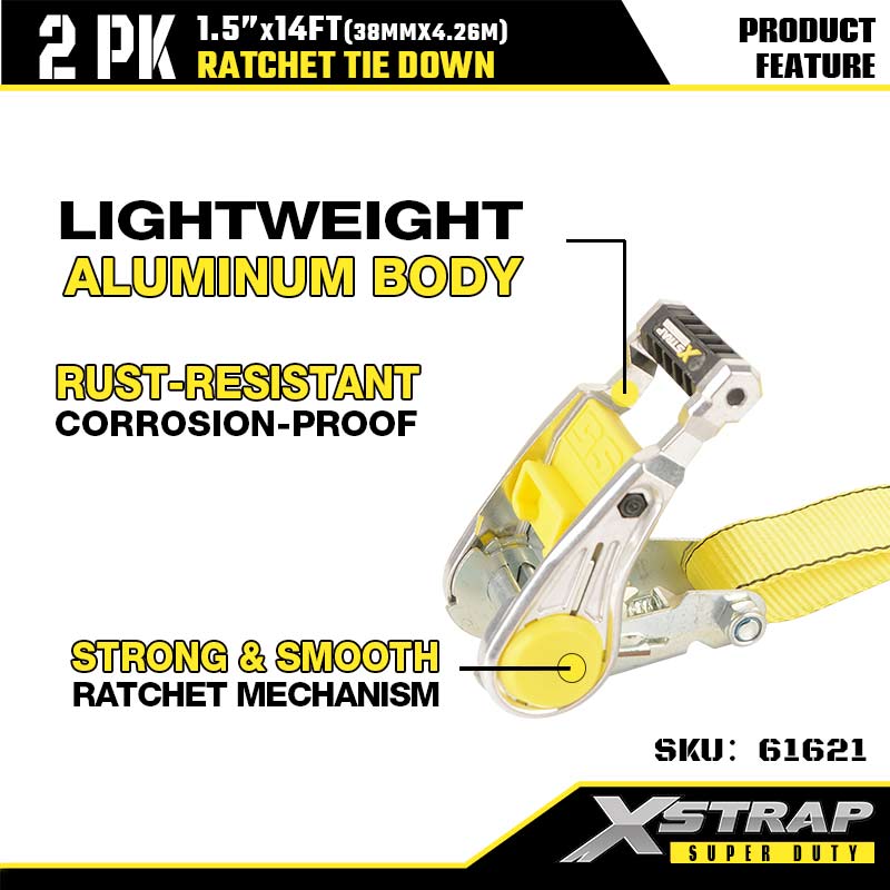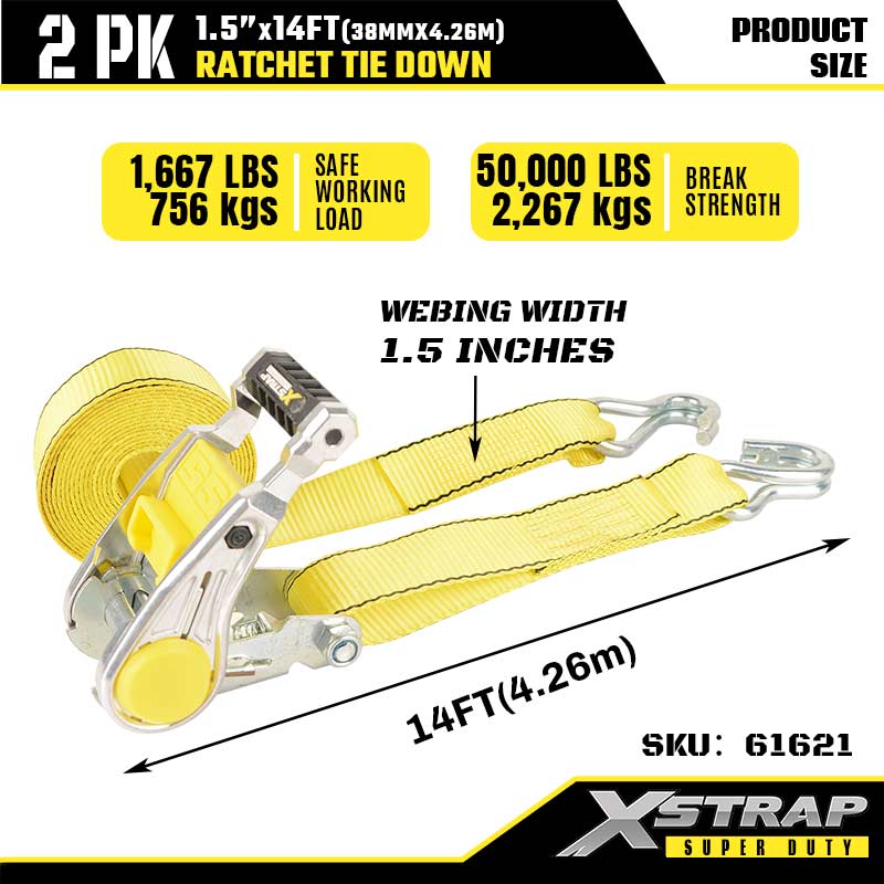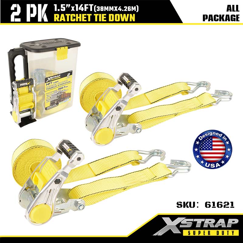 Xstrap 2PK d'arrimage à cliquet avec crochets doubles en J, sangle d'arrimage en polyester de 1-1/2" x 14', sangle à cliquet, capacité de 1667 lb, sangles de sécurité avec crochets doubles en J pour remorque robuste, remorque à plateau plat, bateau de ski, petite voiture, équipement lourd.